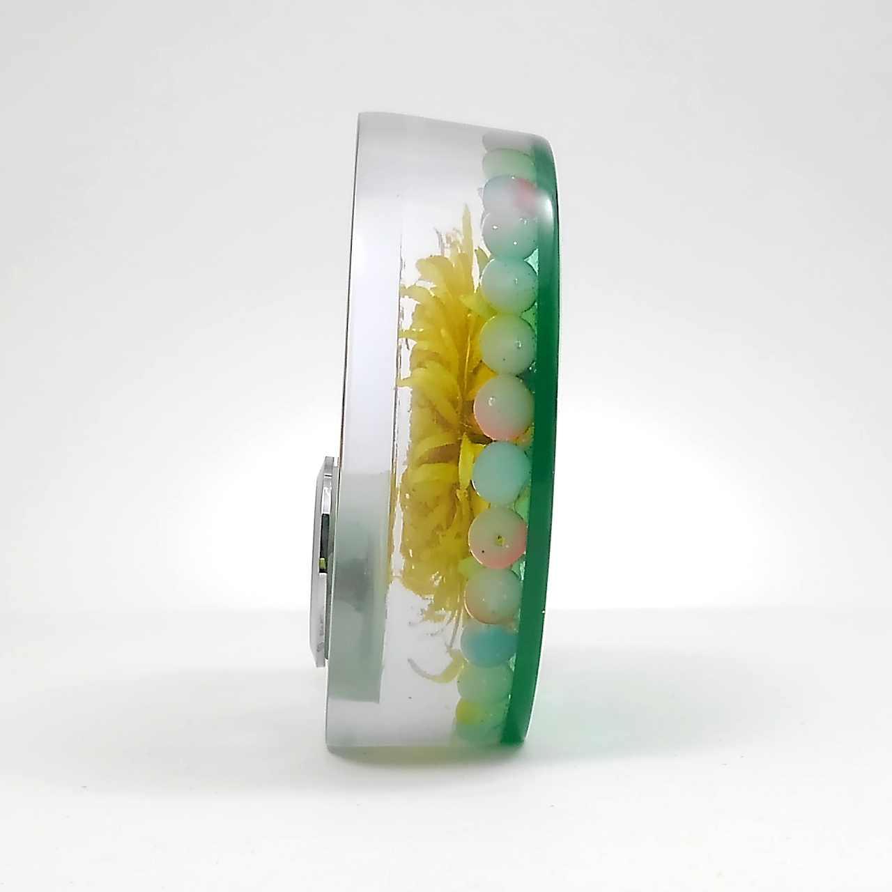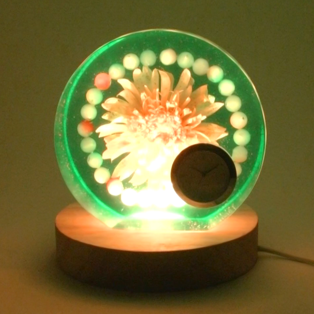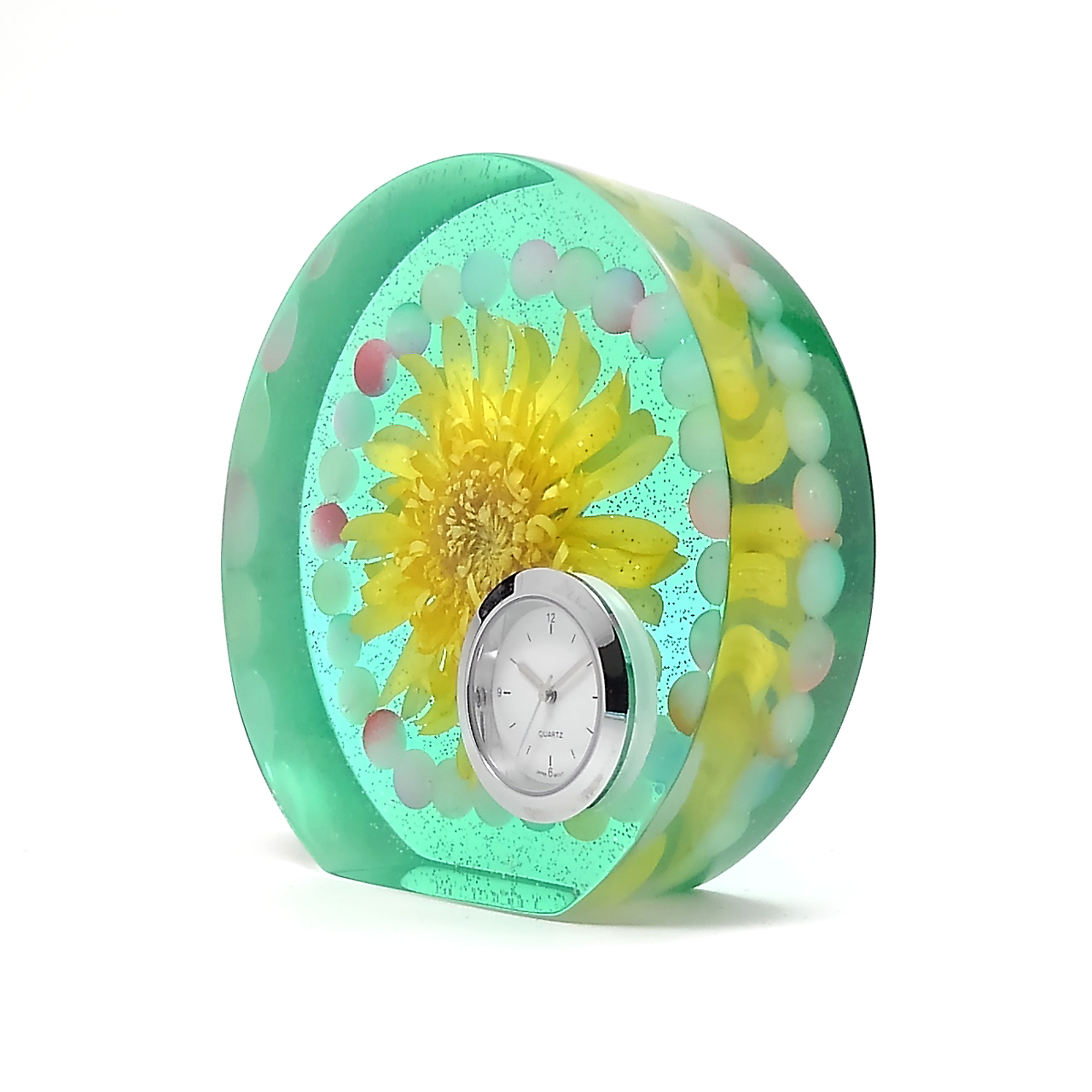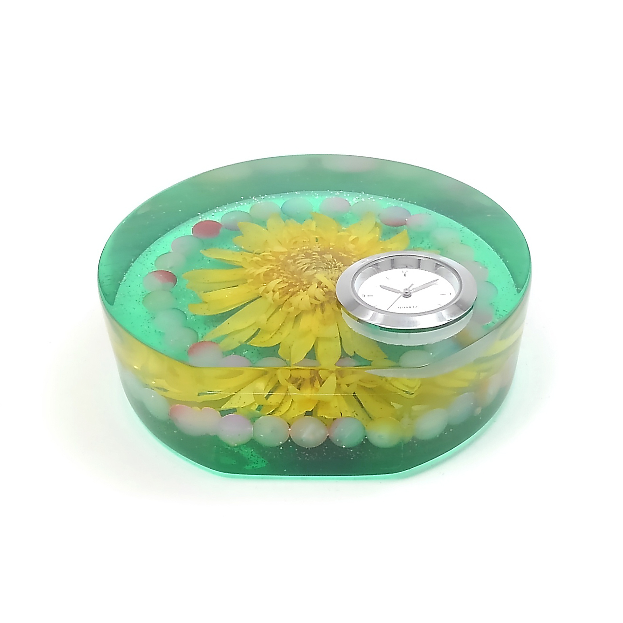 ドライフラワーガーベラをエポキシレジンに封入した置き時計です。