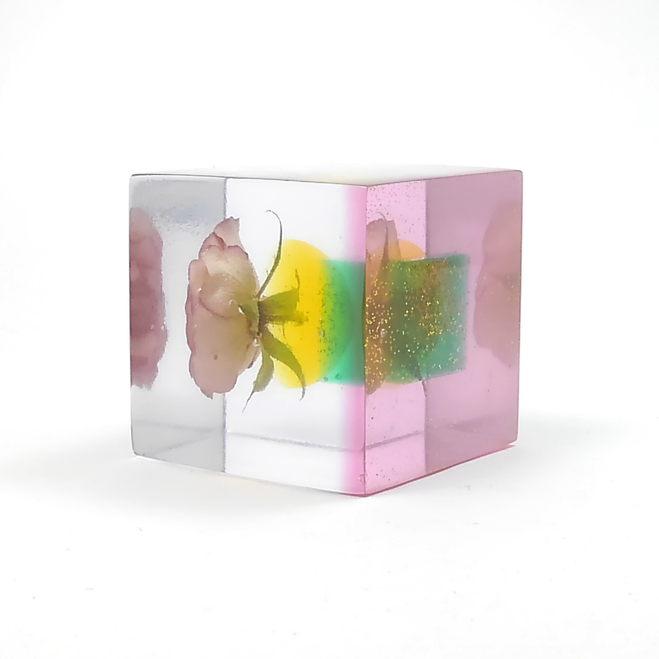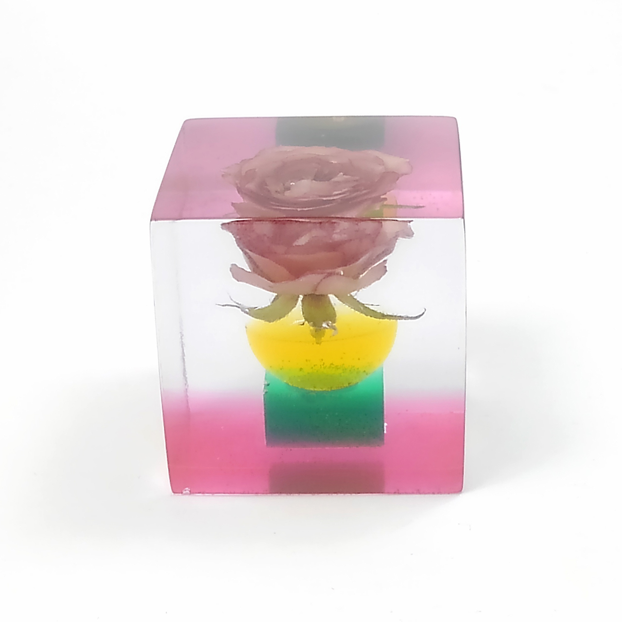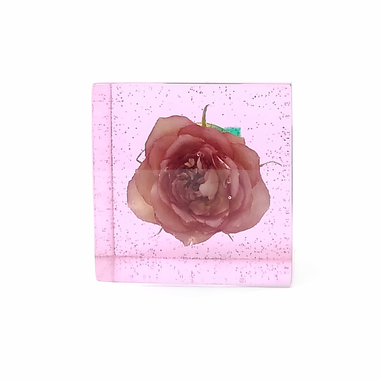 ドライフラワーバラをエポキシレジンに封入したキューブです。