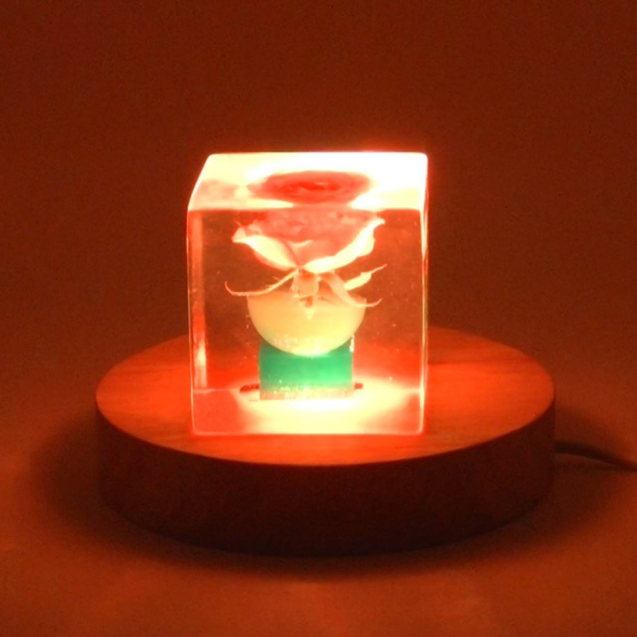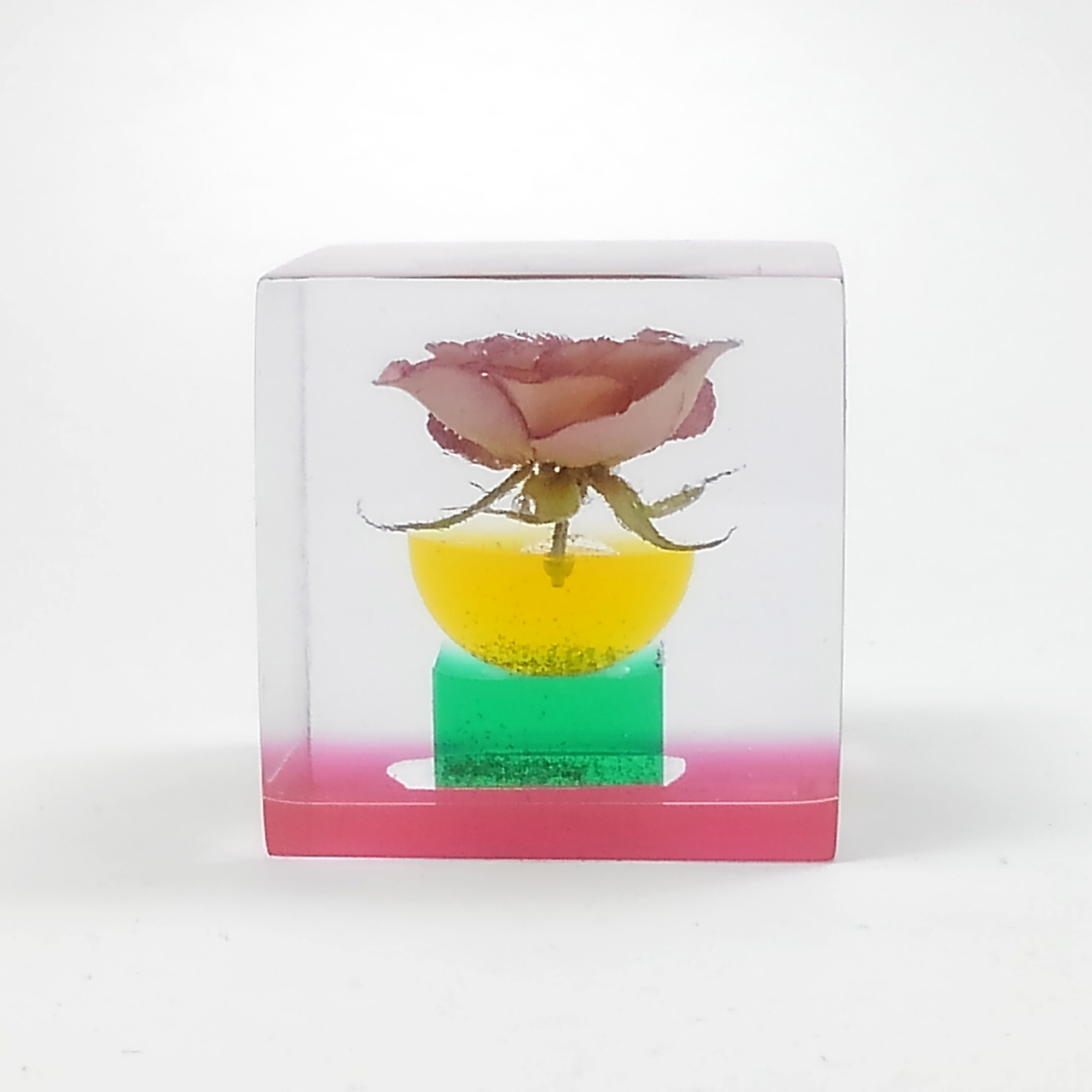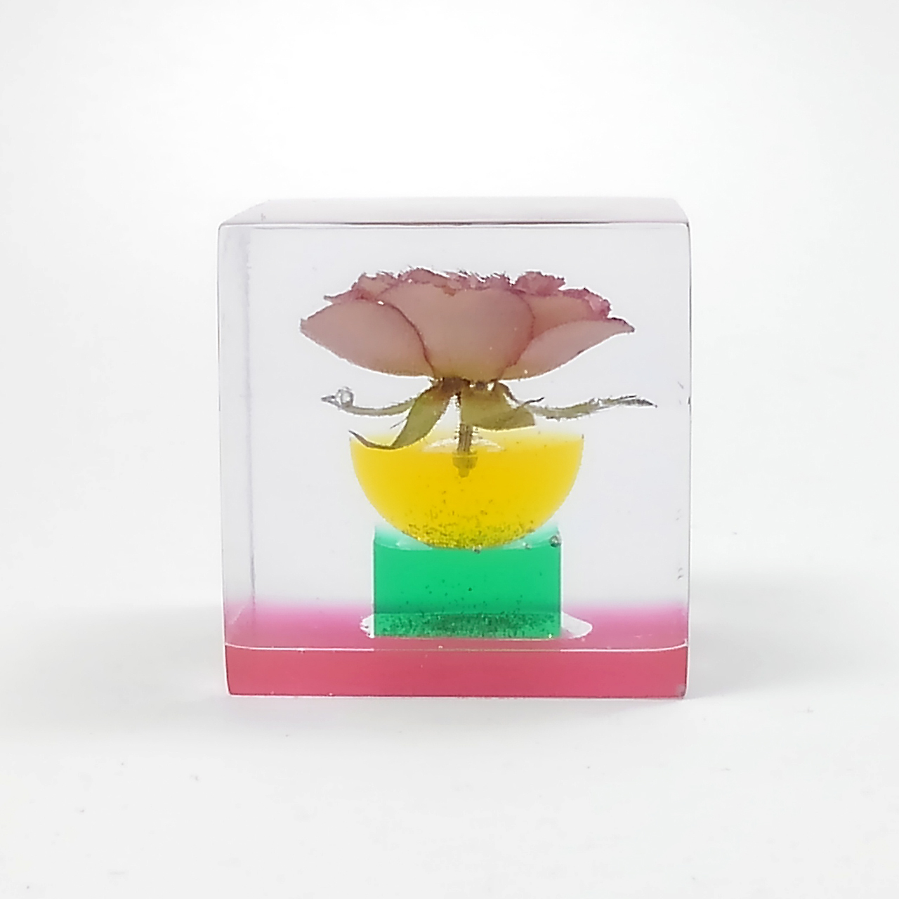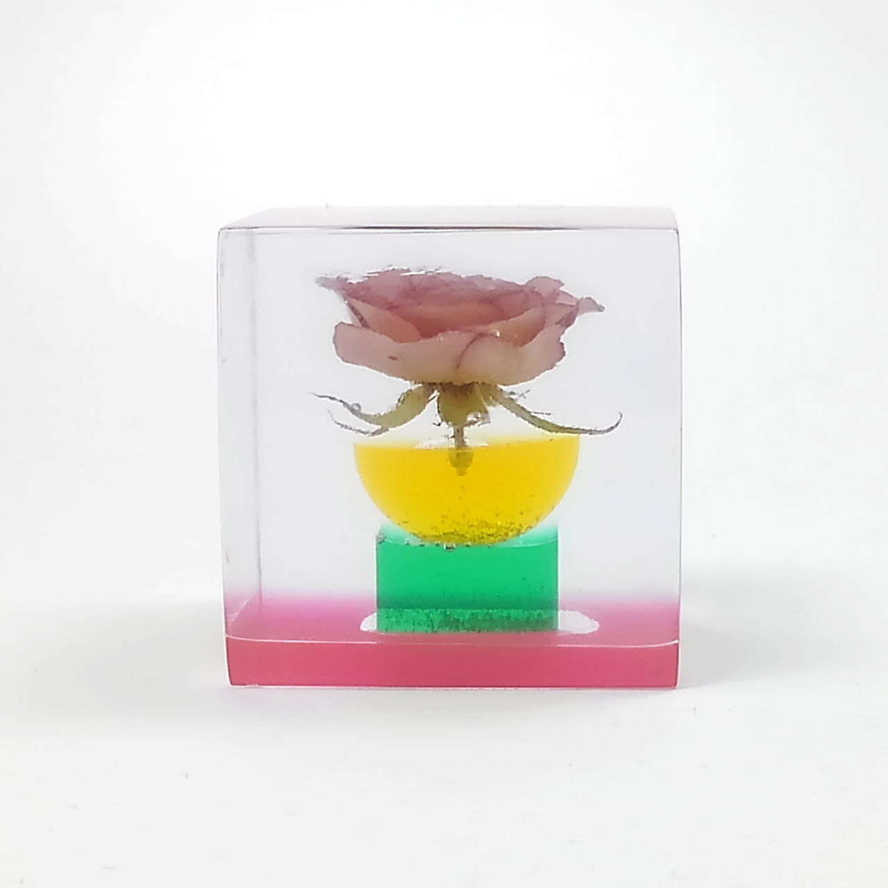 ドライフラワーバラをエポキシレジンに封入したキューブです。