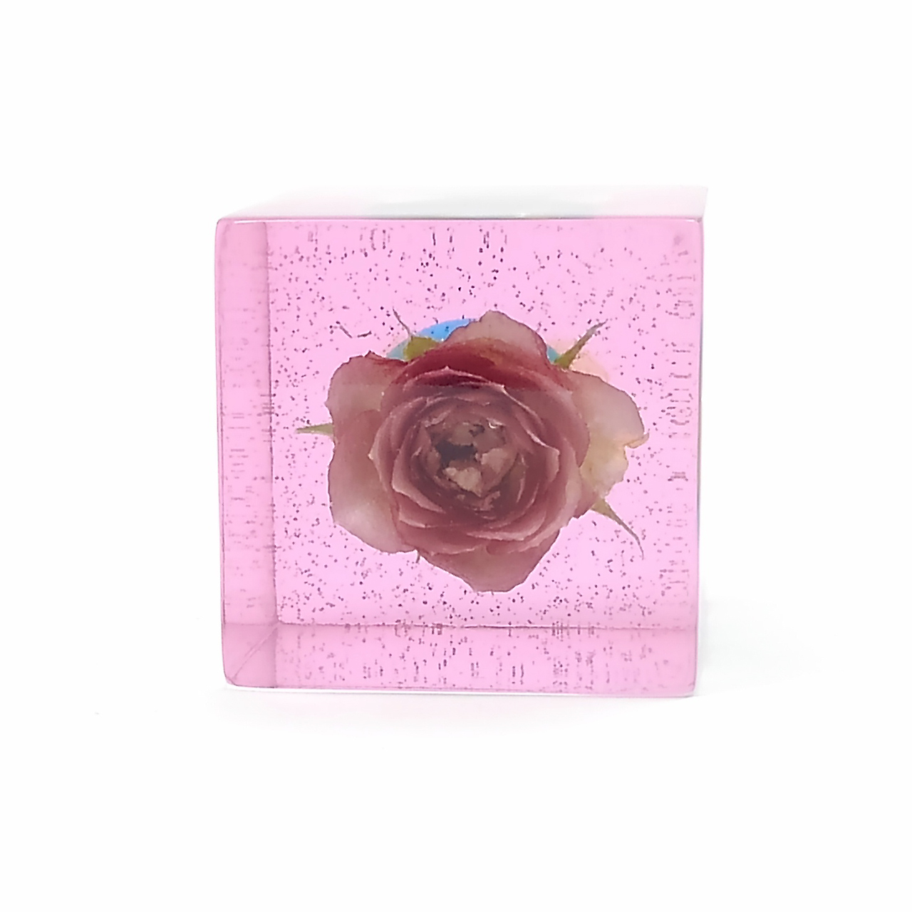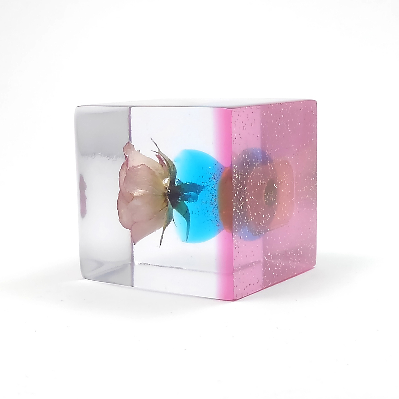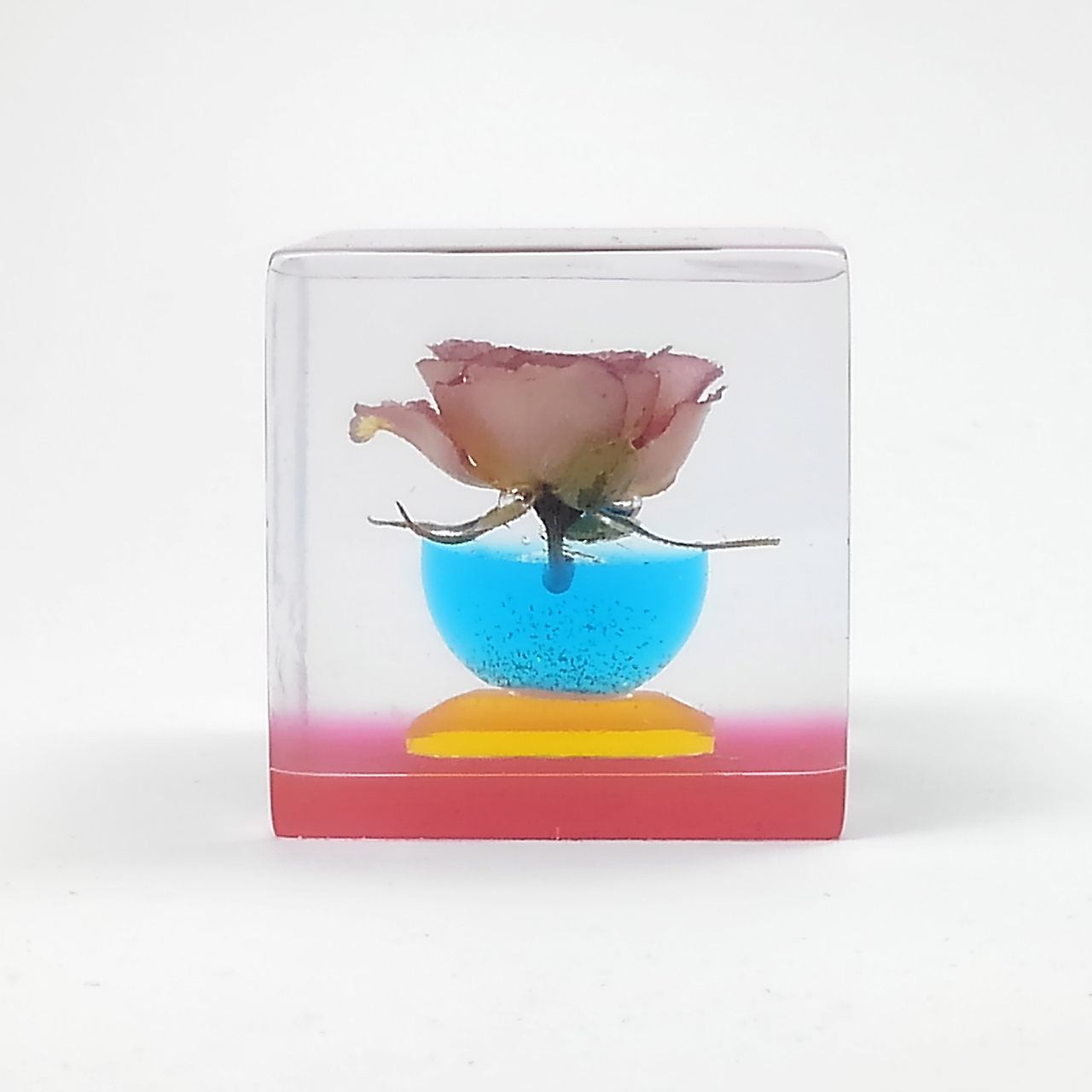 ドライフラワーバラをエポキシレジンに封入したキューブです。