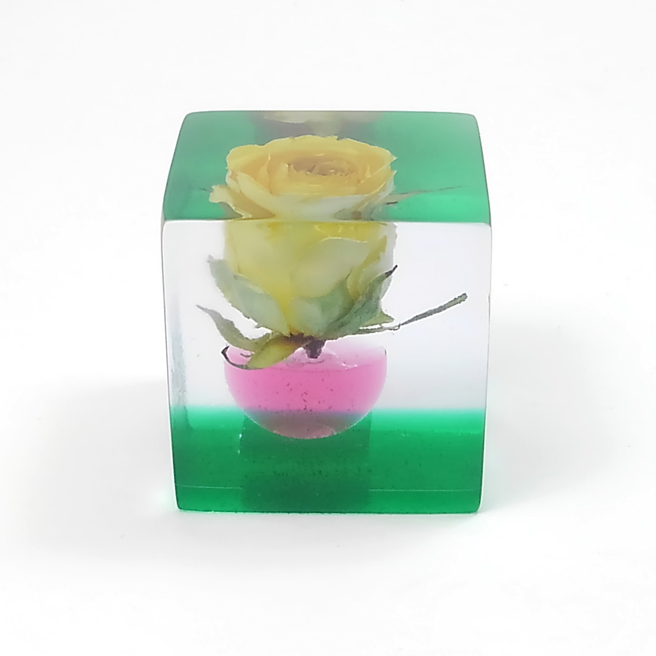 ドライフラワーバラをエポキシレジンに封入したキューブです。