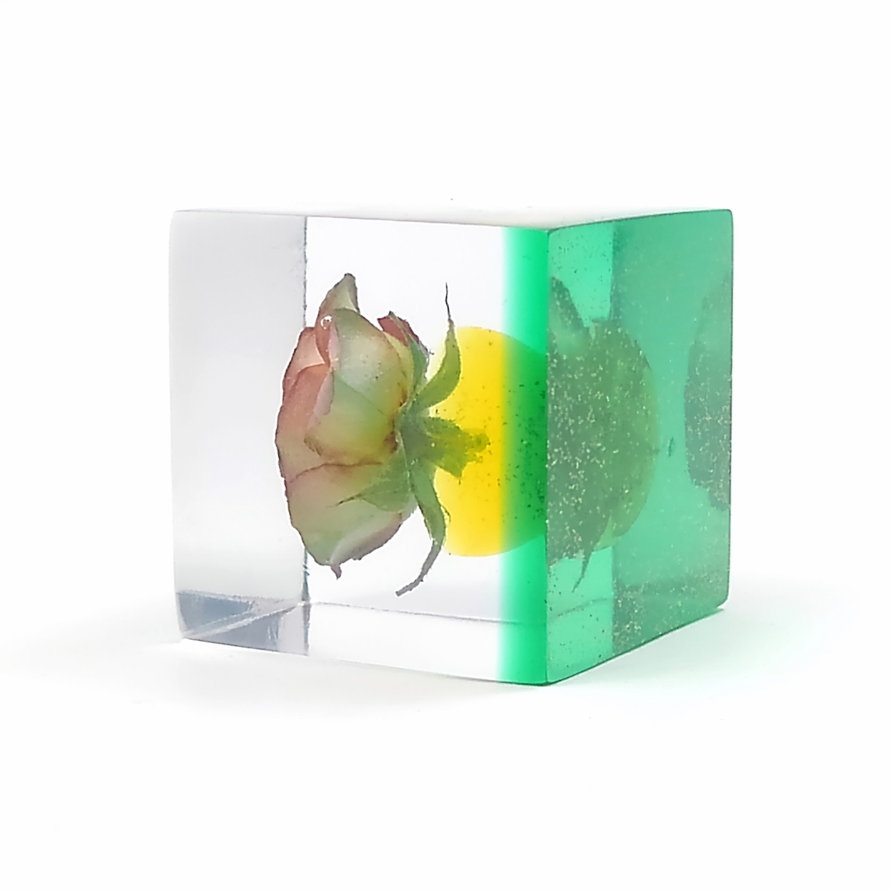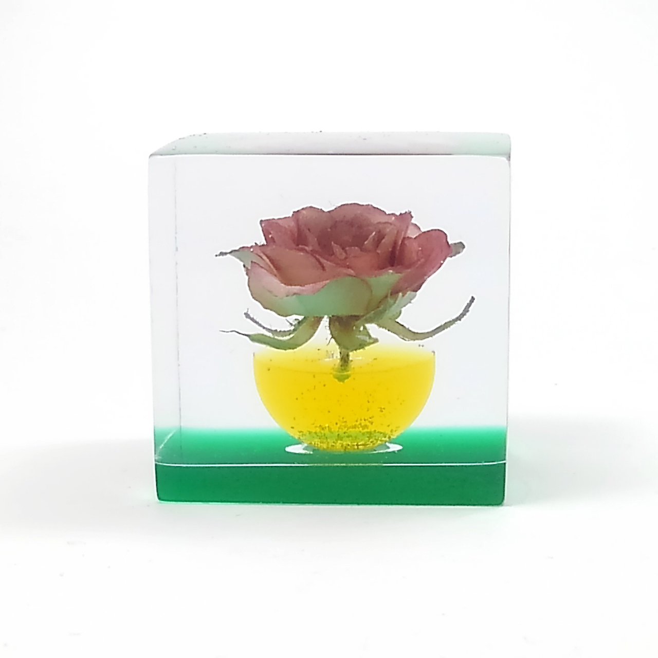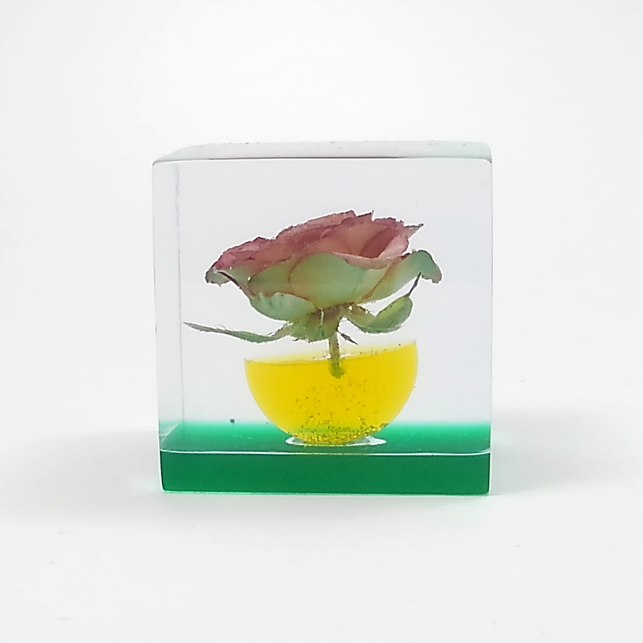 ドライフラワーバラをエポキシレジンに封入したキューブです。