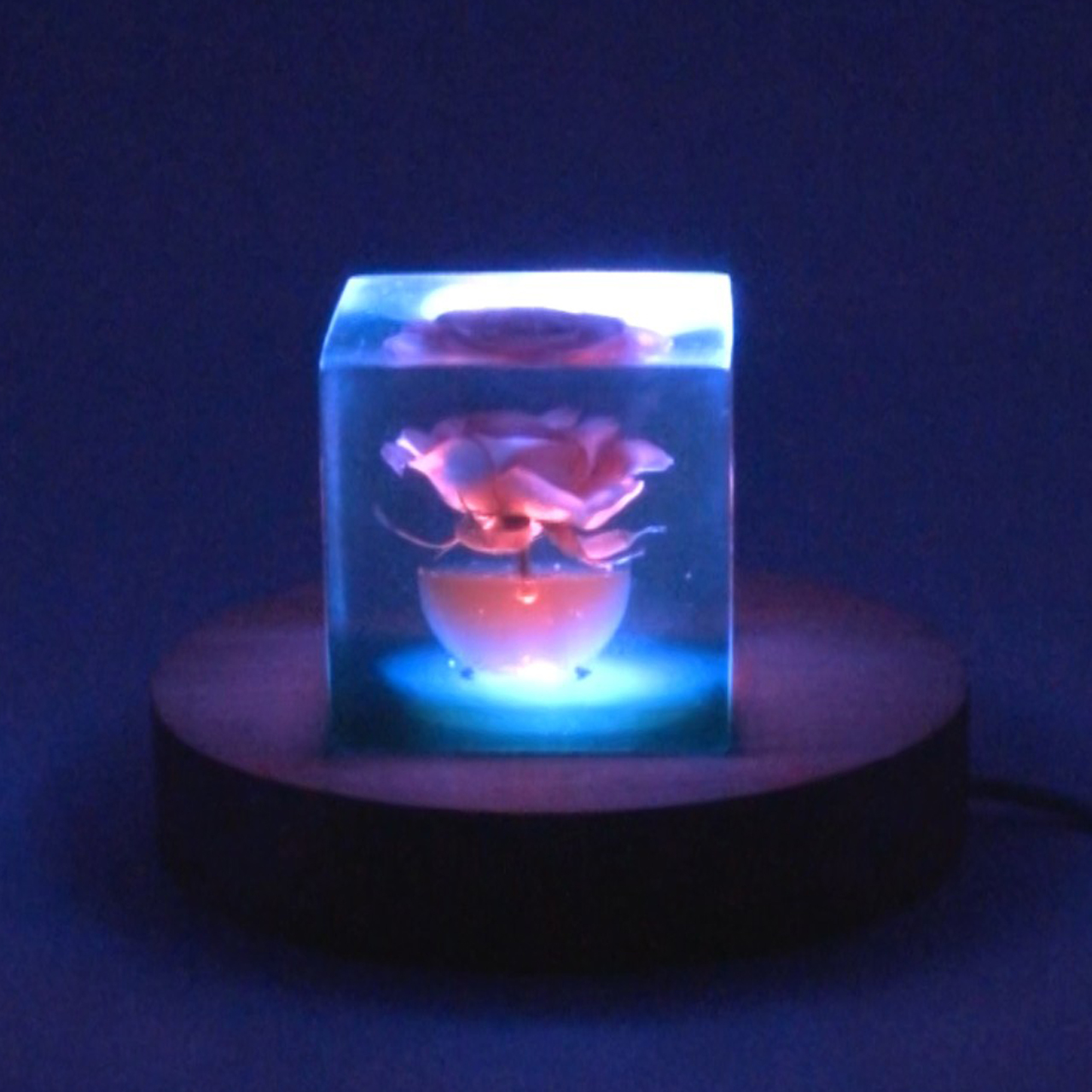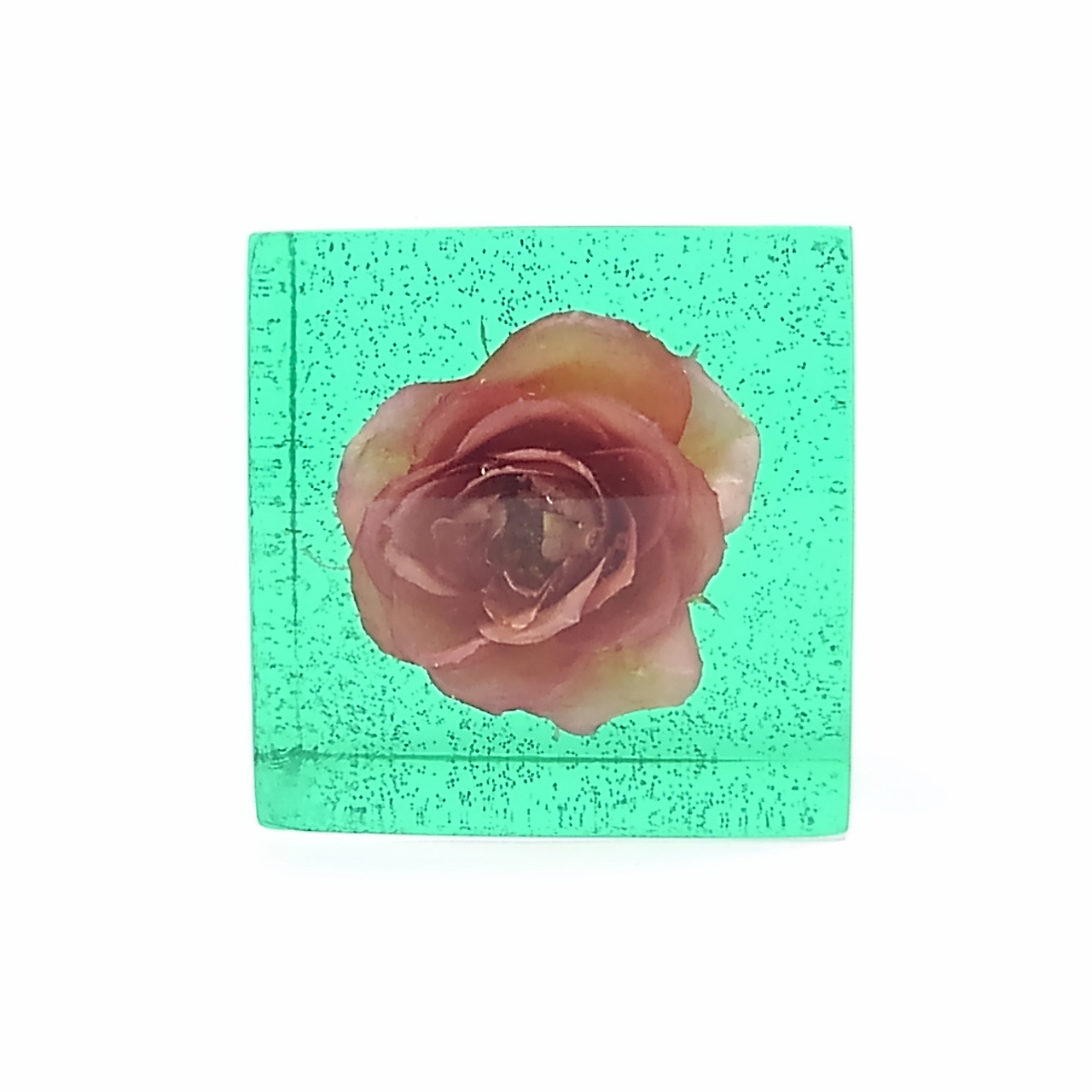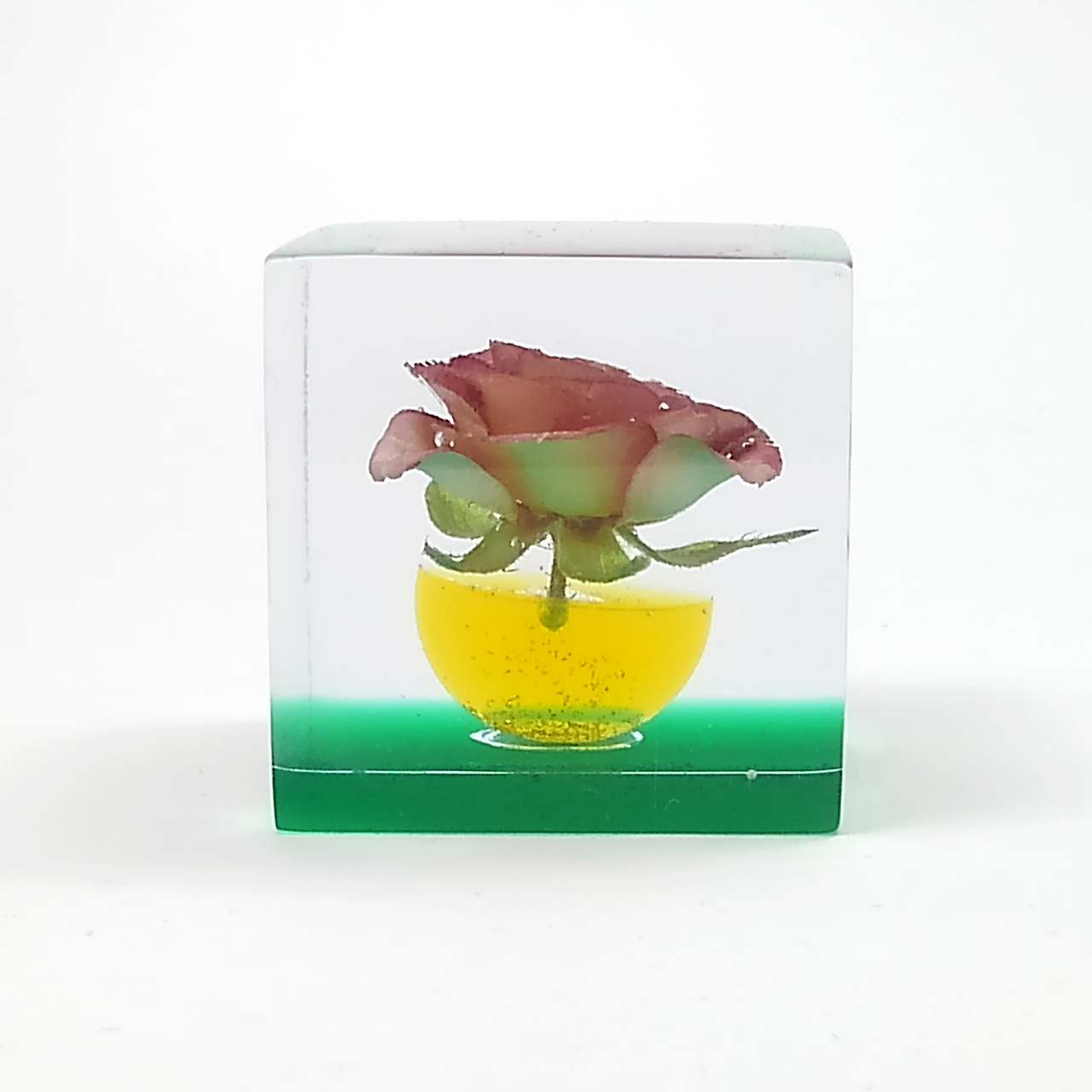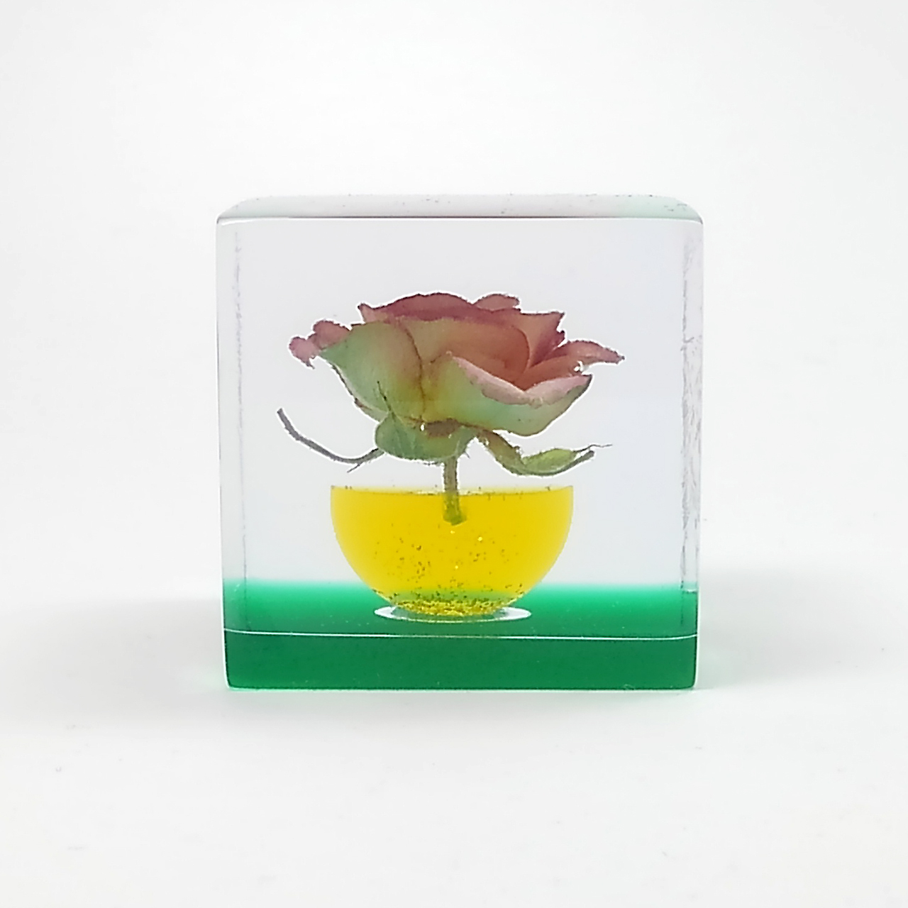 ドライフラワーバラをエポキシレジンに封入したキューブです。