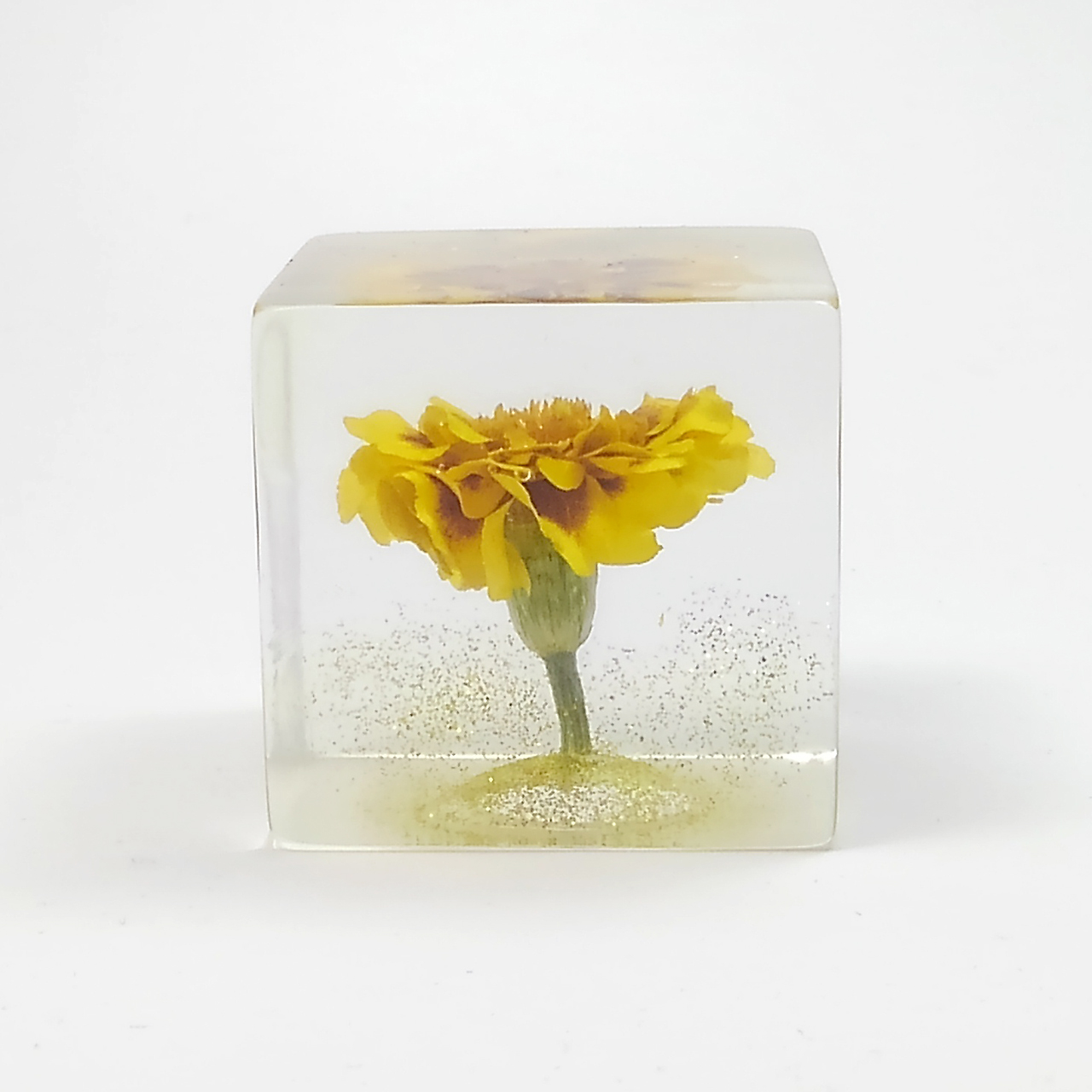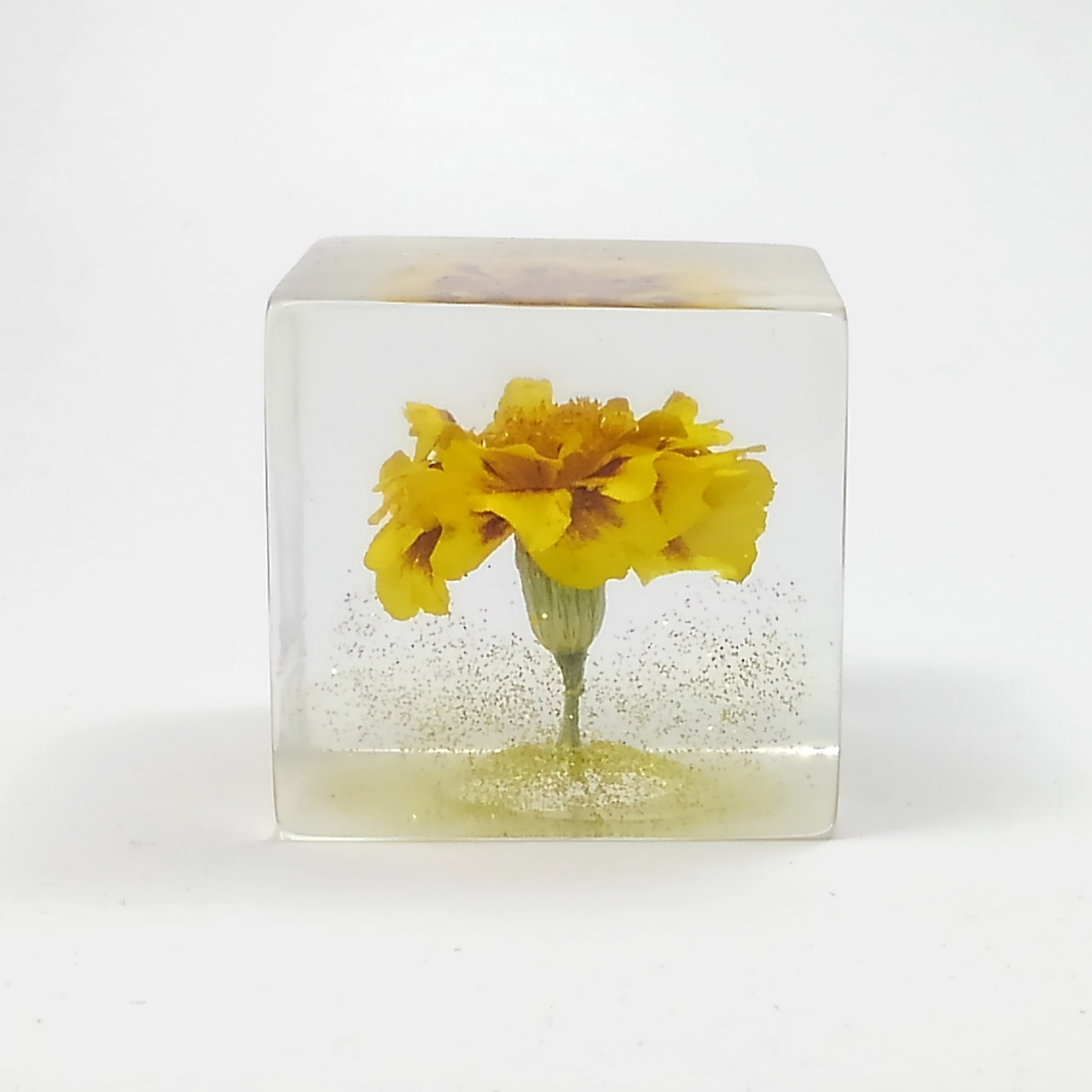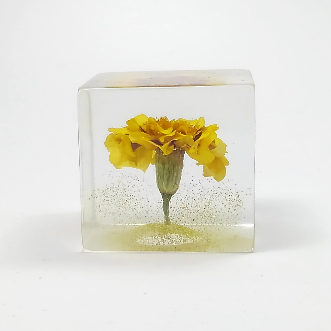 ドライフラワーマリーゴールドをエポキシレジンに封入したキューブです。