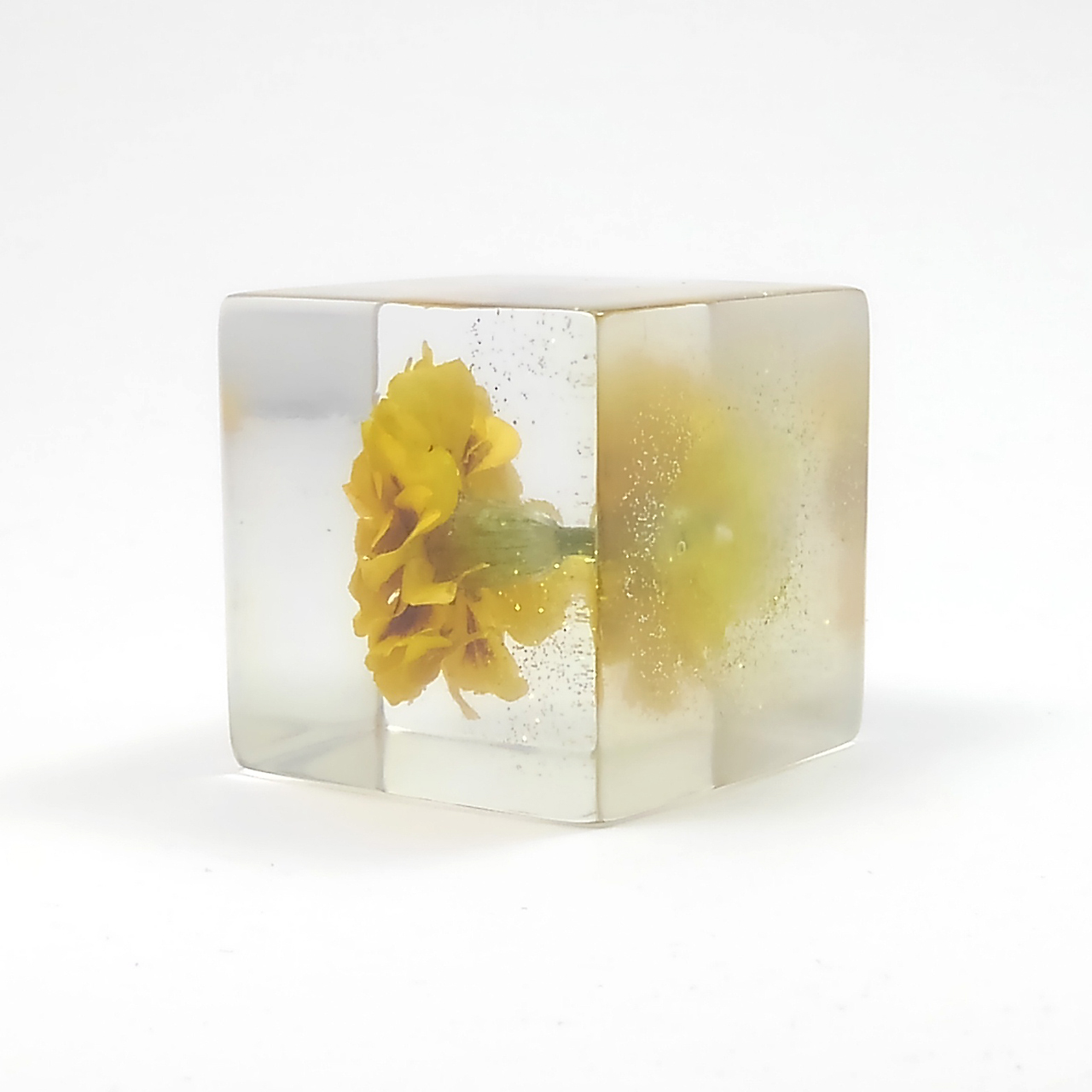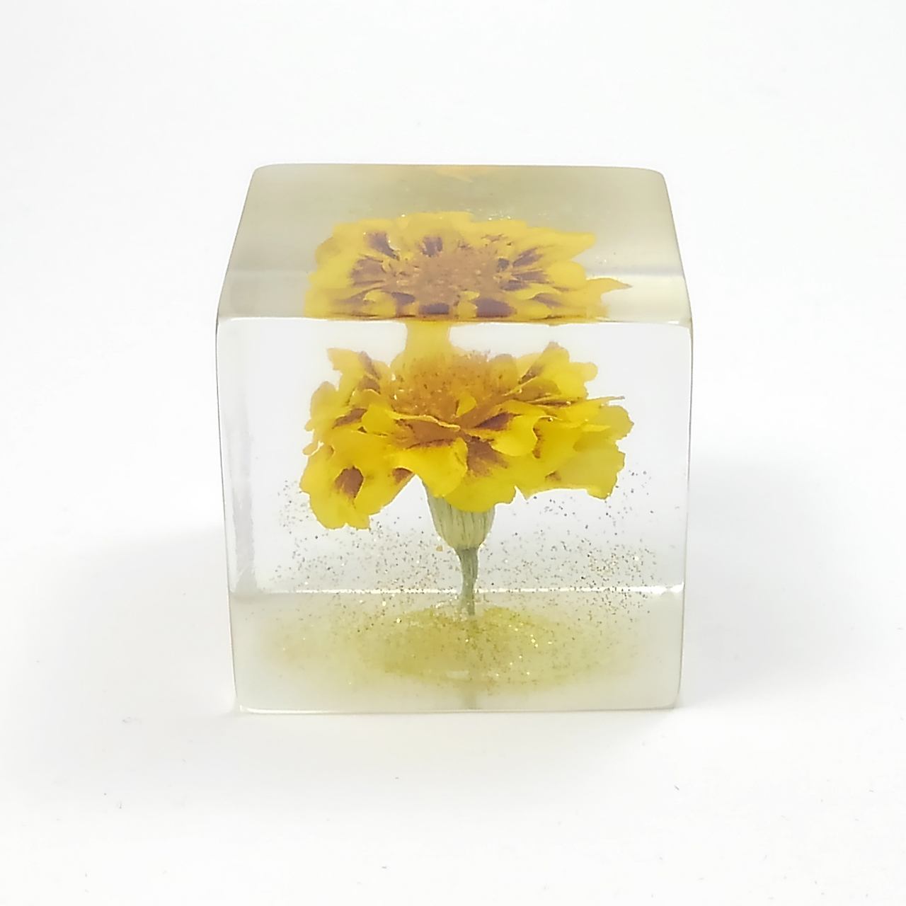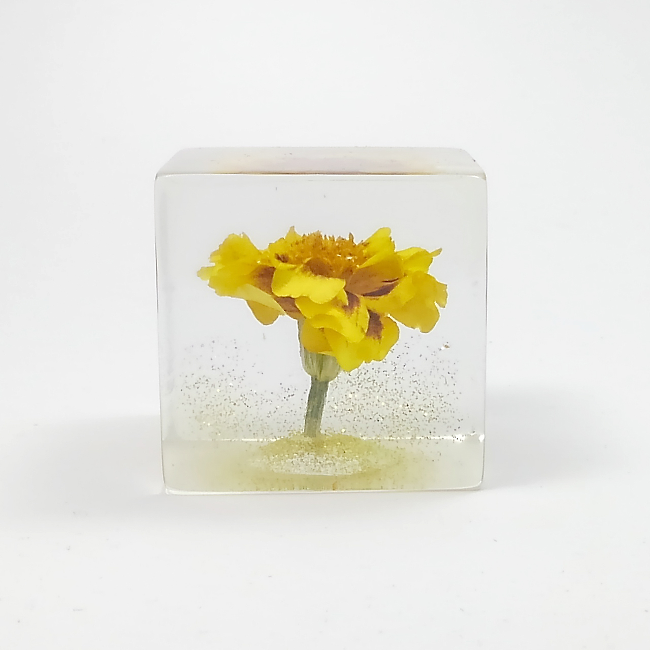 ドライフラワーマリーゴールドをエポキシレジンに封入したキューブです。