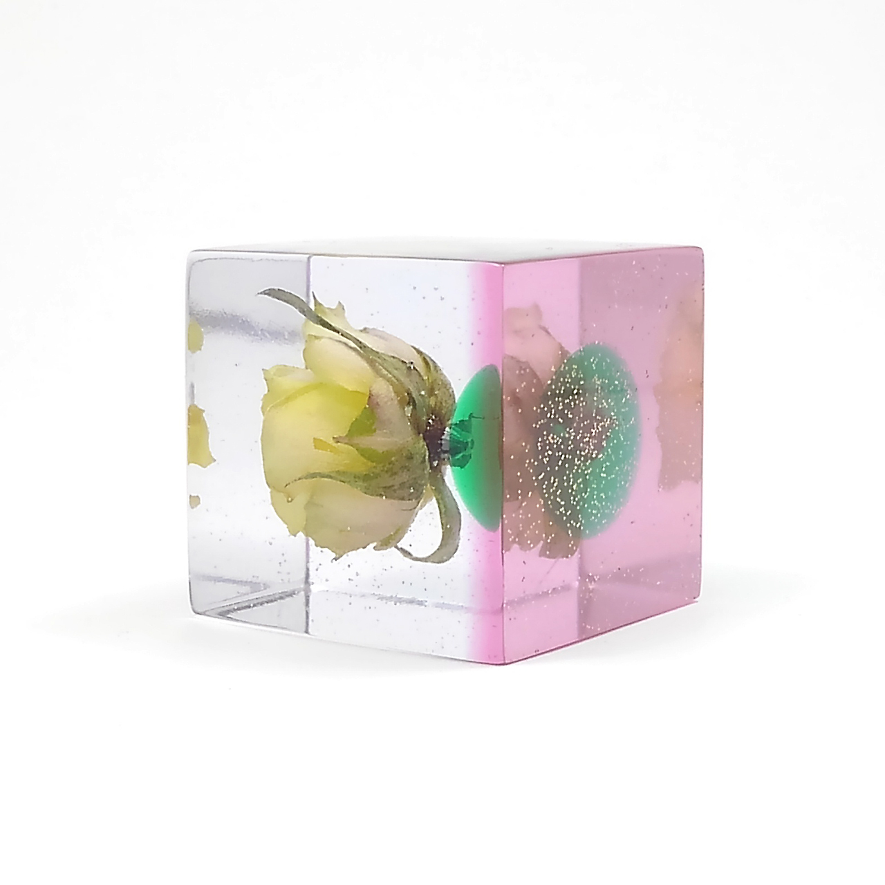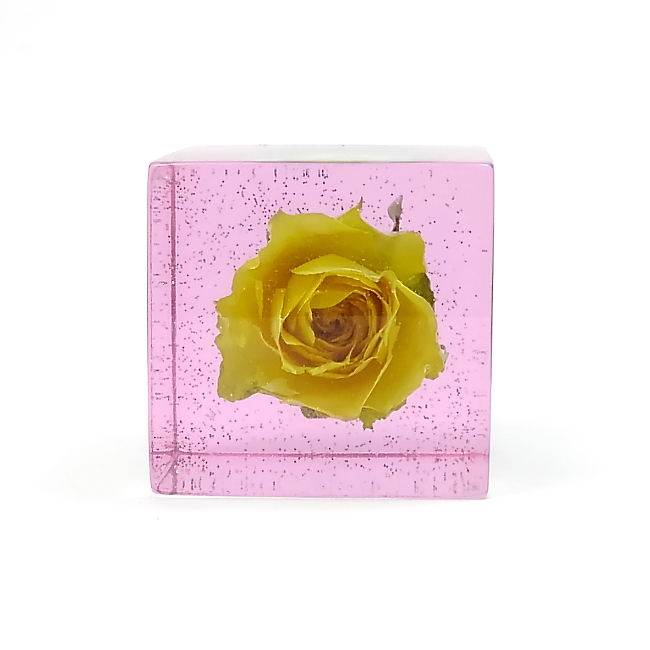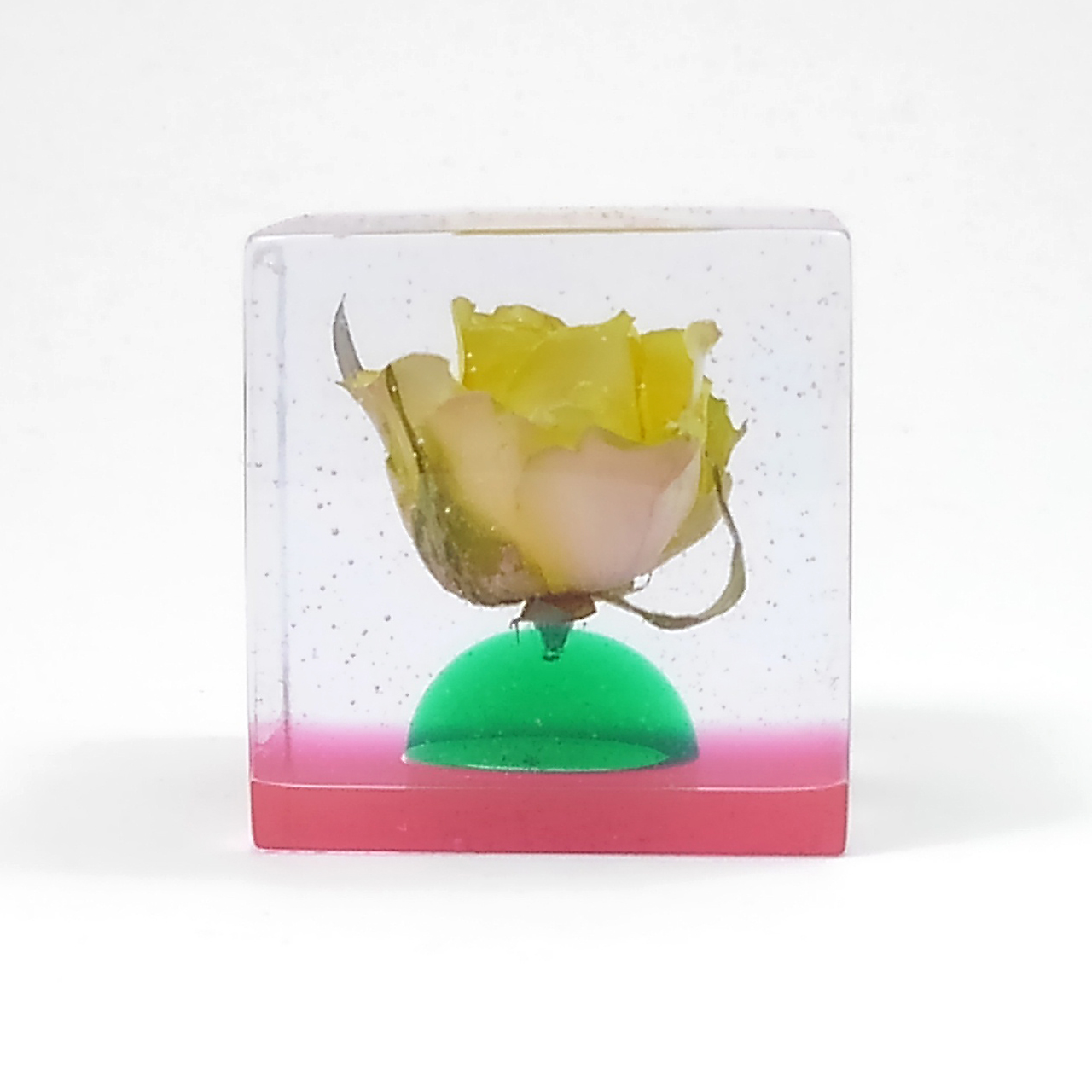 ドライフラワーバラをエポキシレジンに封入したキューブです。