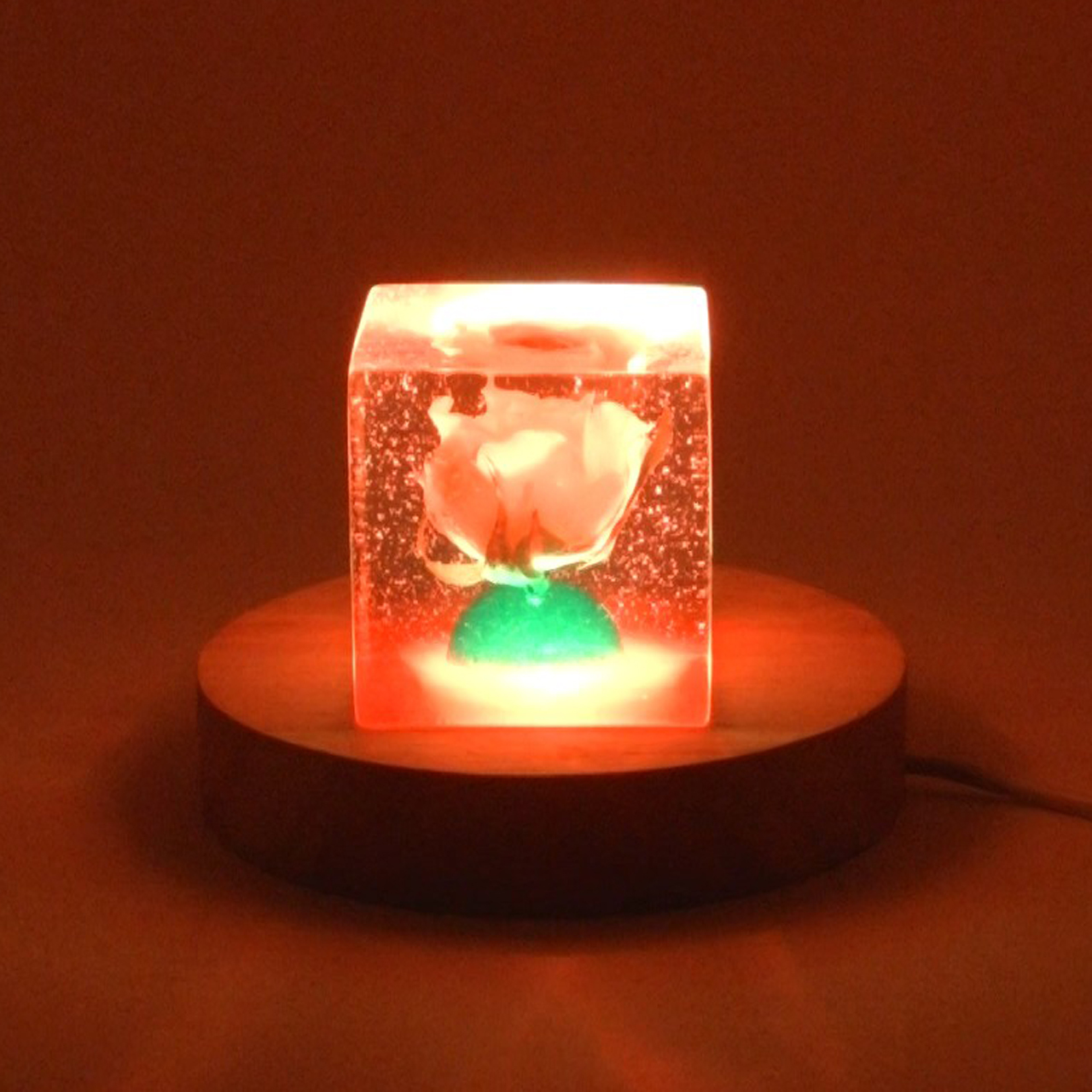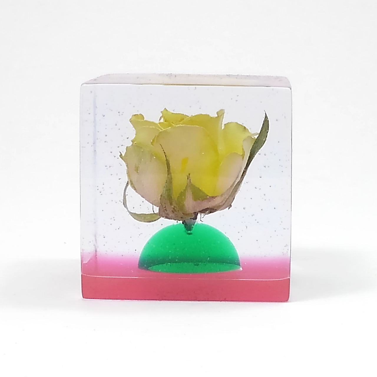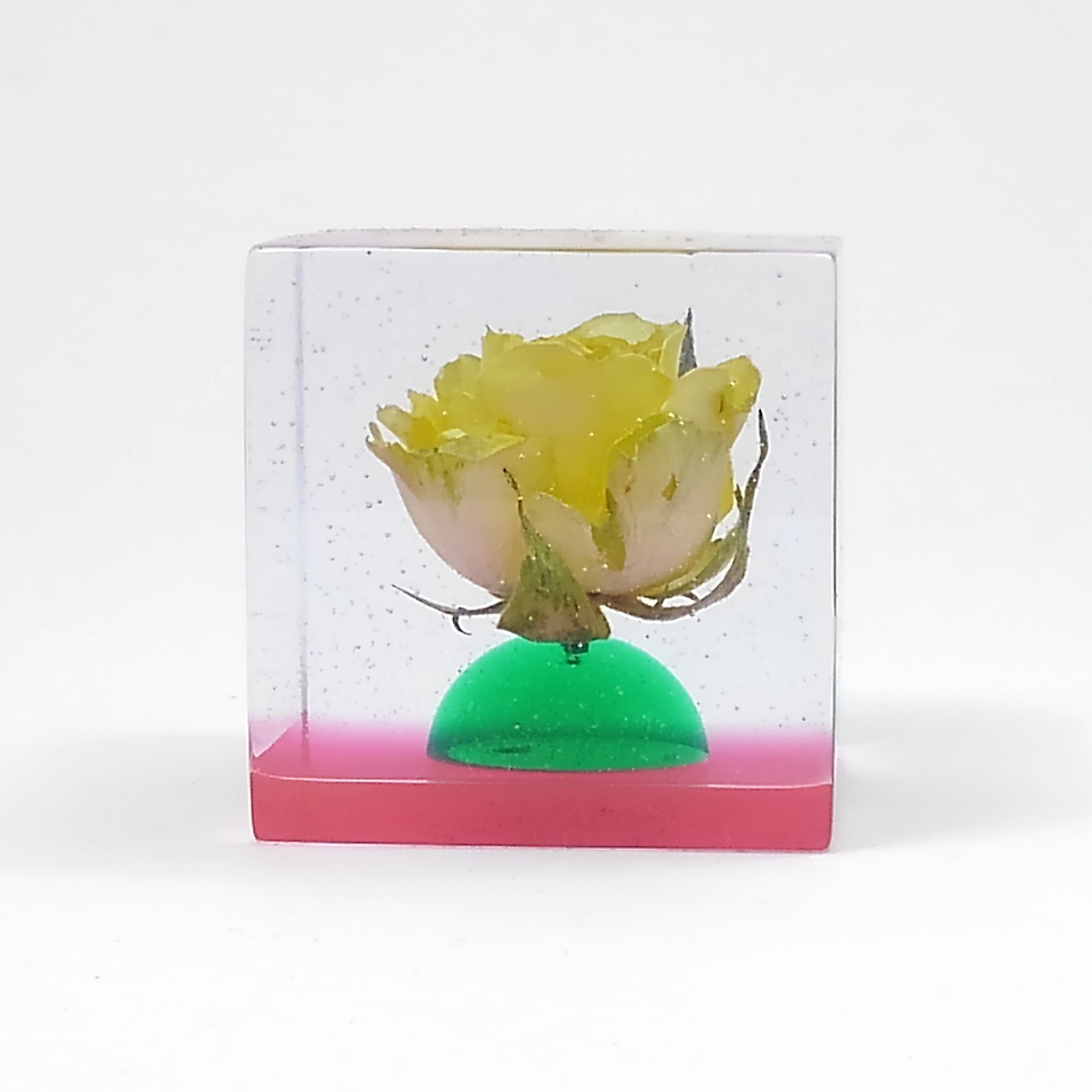 ドライフラワーバラをエポキシレジンに封入したキューブです。