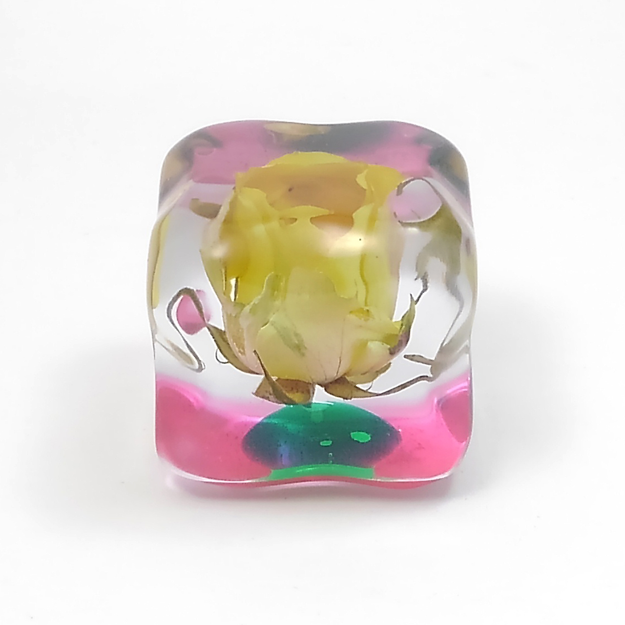 ドライフラワーバラをエポキシレジンに封入したキューブです。