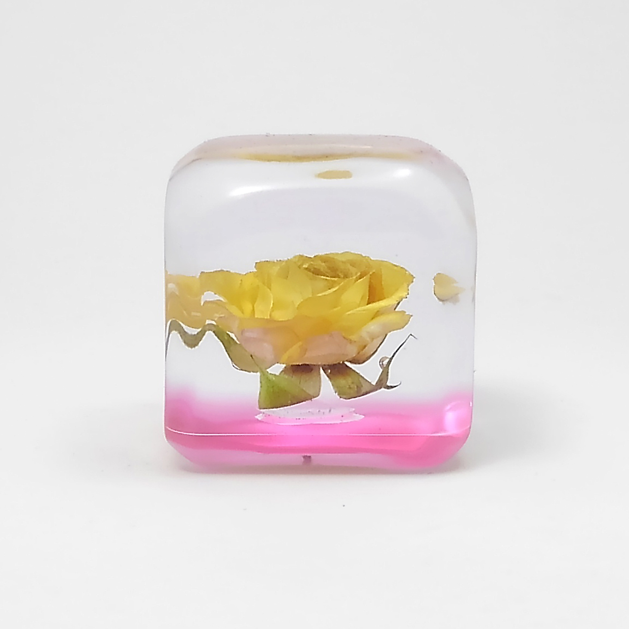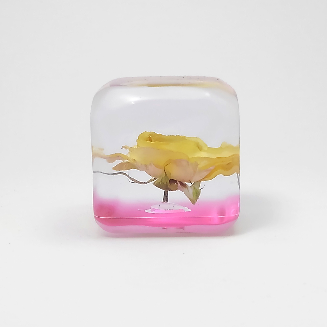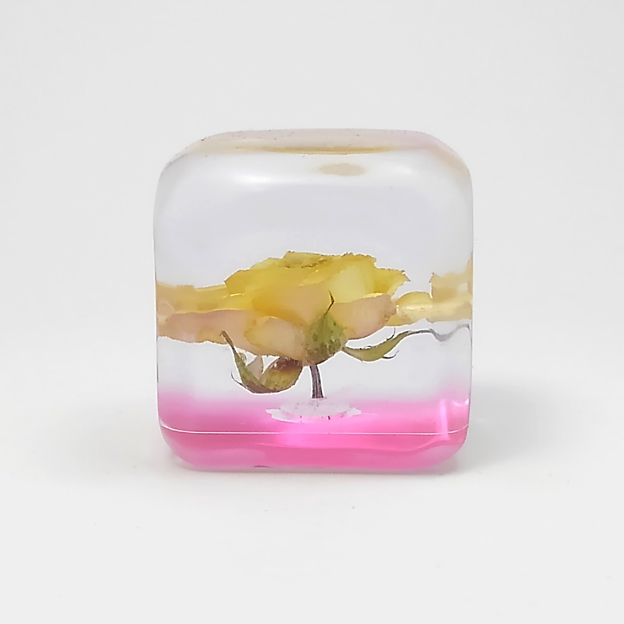 ドライフラワーバラをエポキシレジンに封入したキューブです。