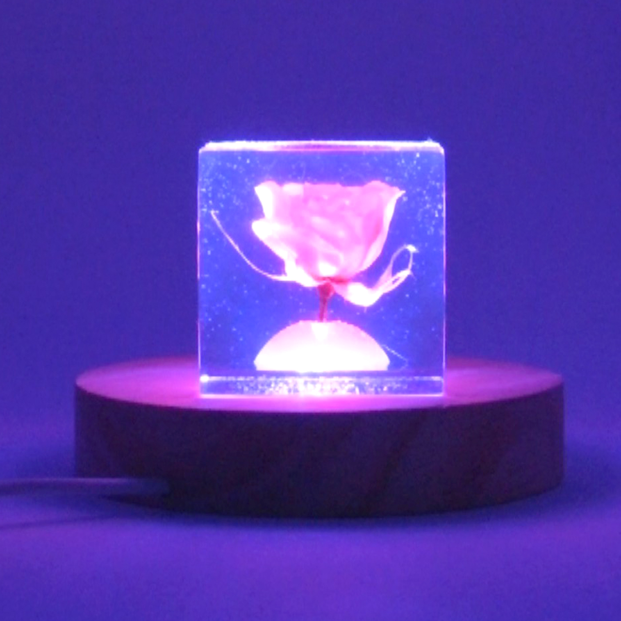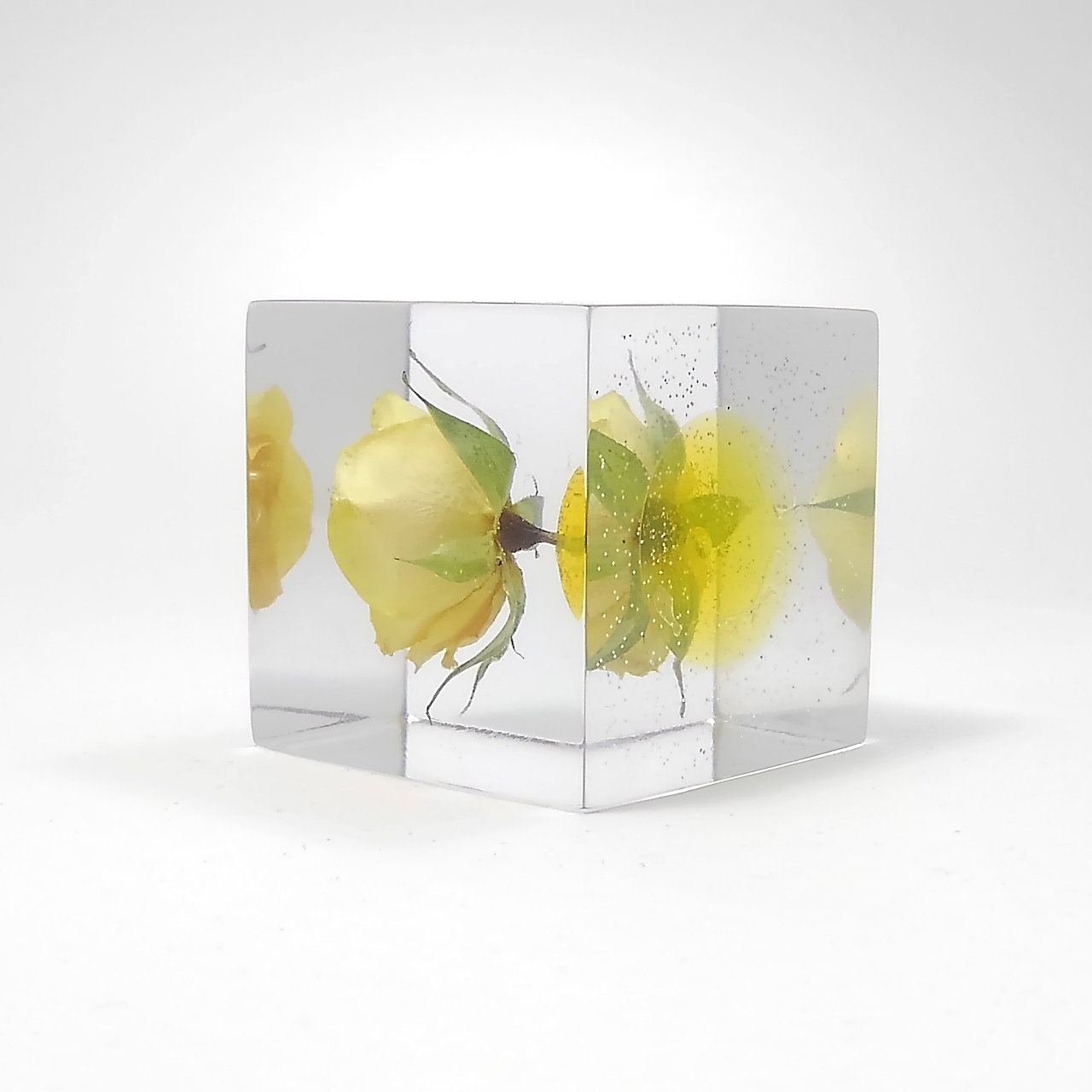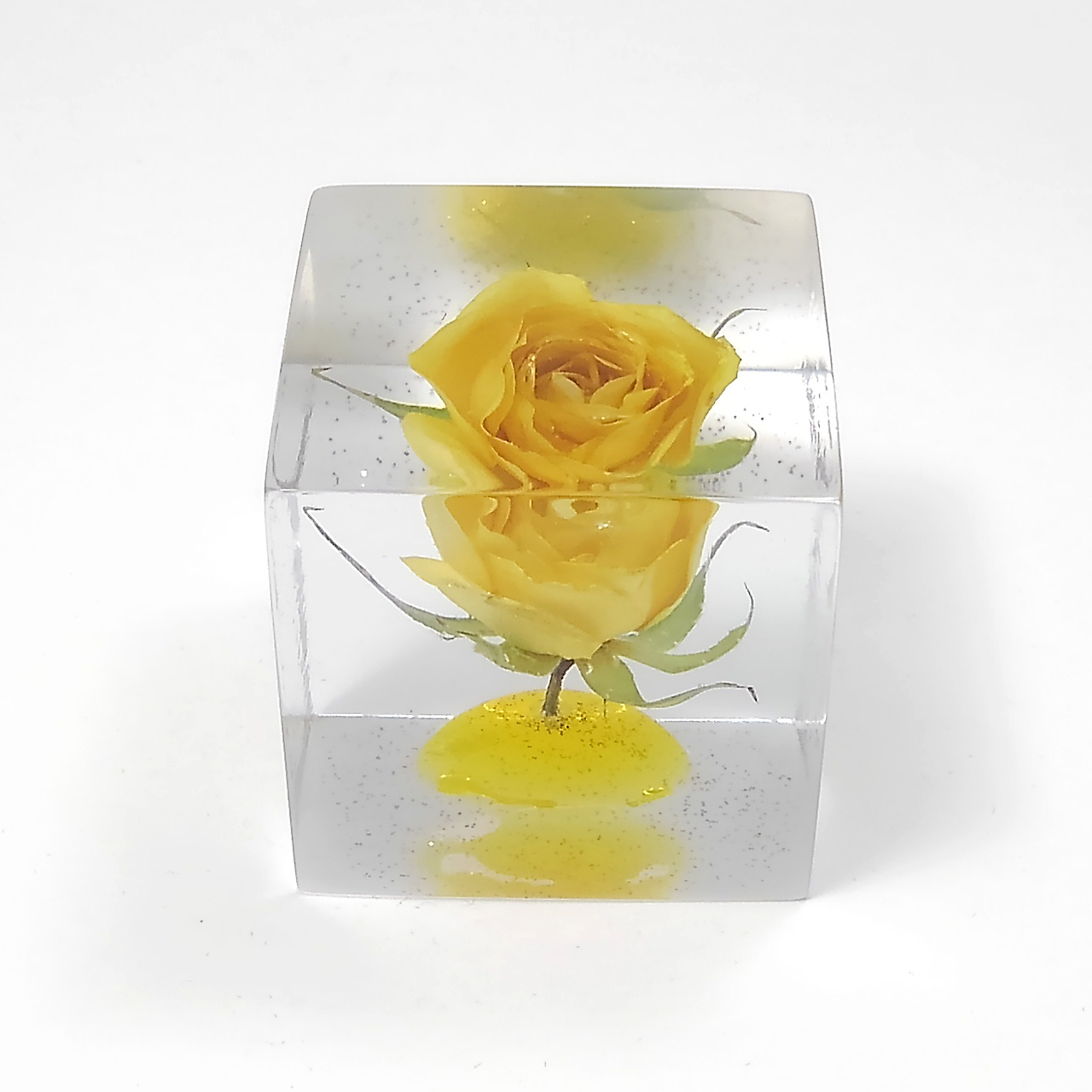 ドライフラワーバラをエポキシレジンに封入したキューブです。