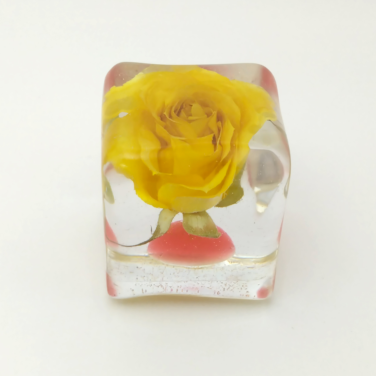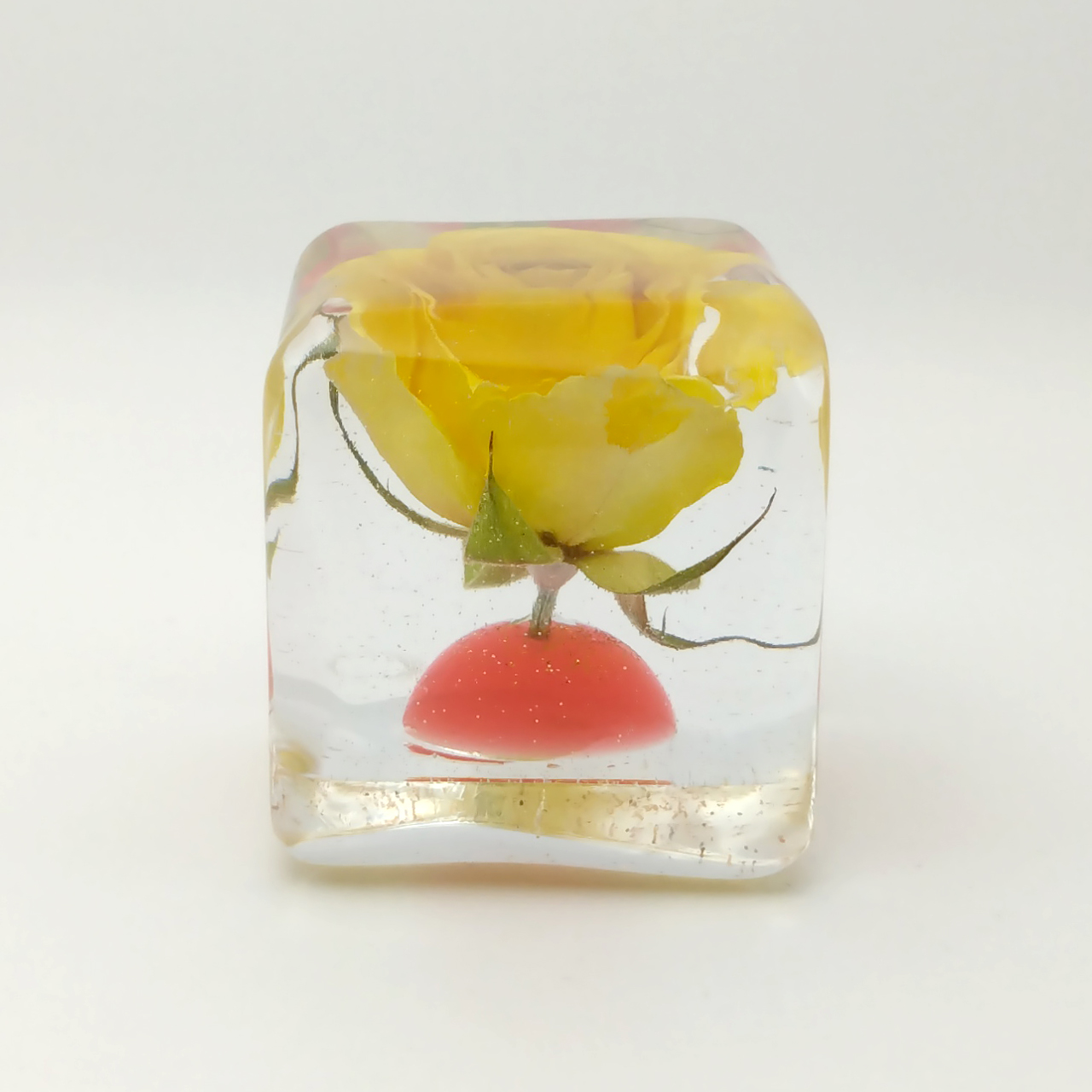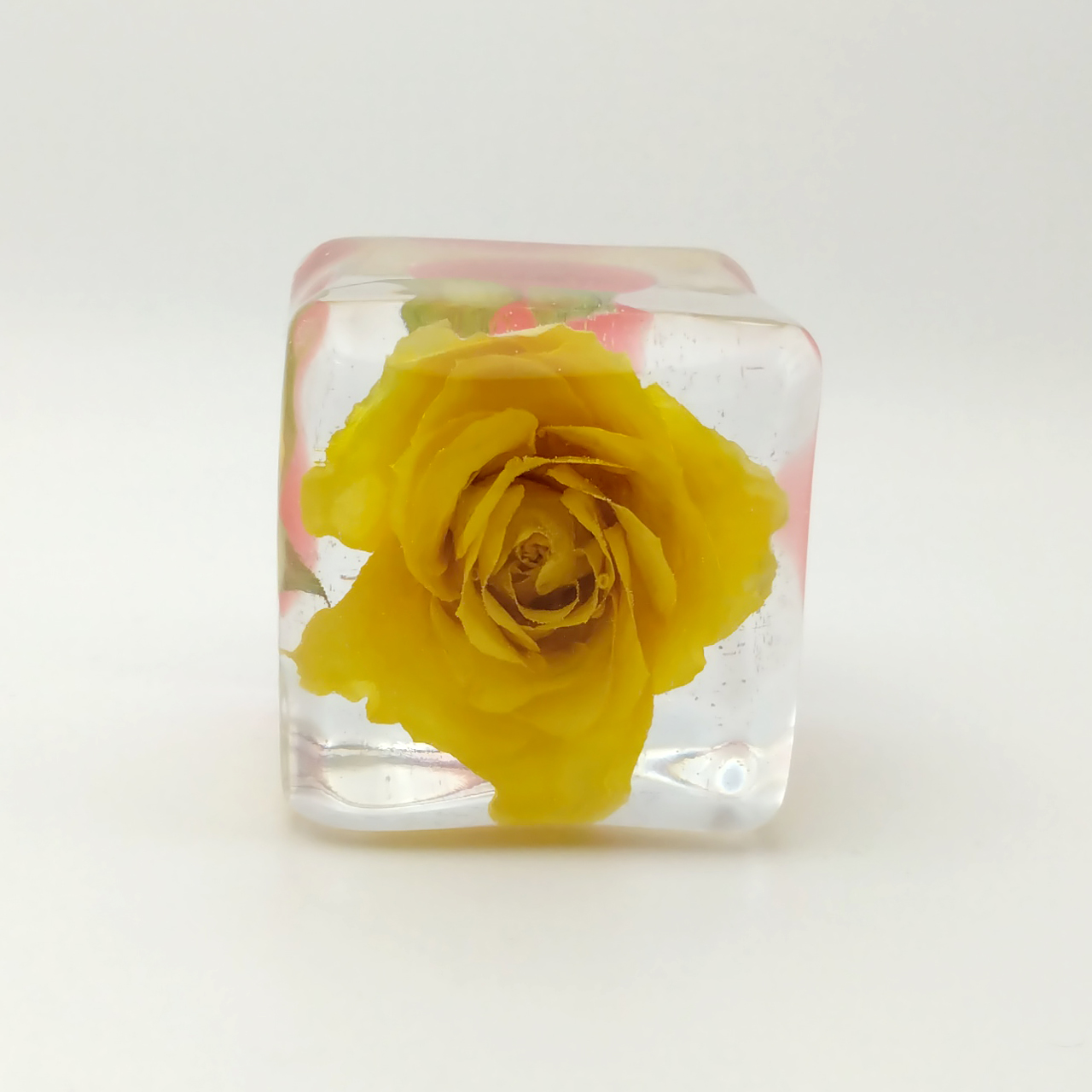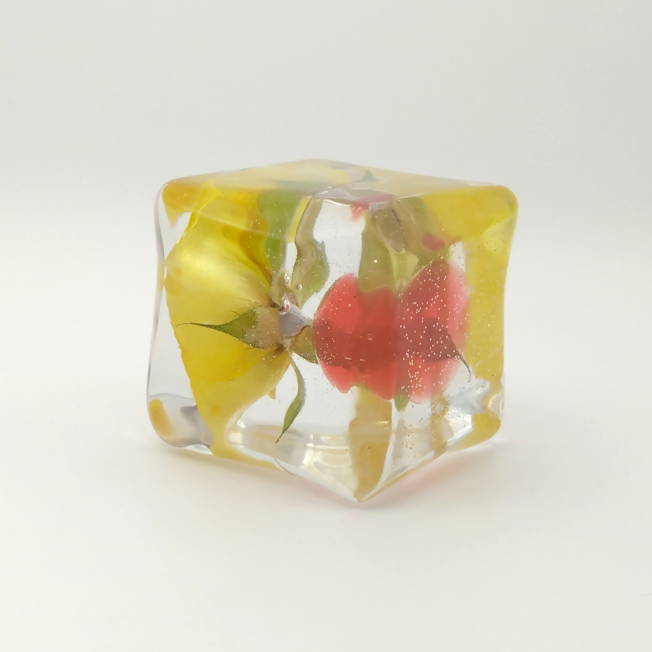 ドライフラワーバラをエポキシレジンに封入したキューブです。