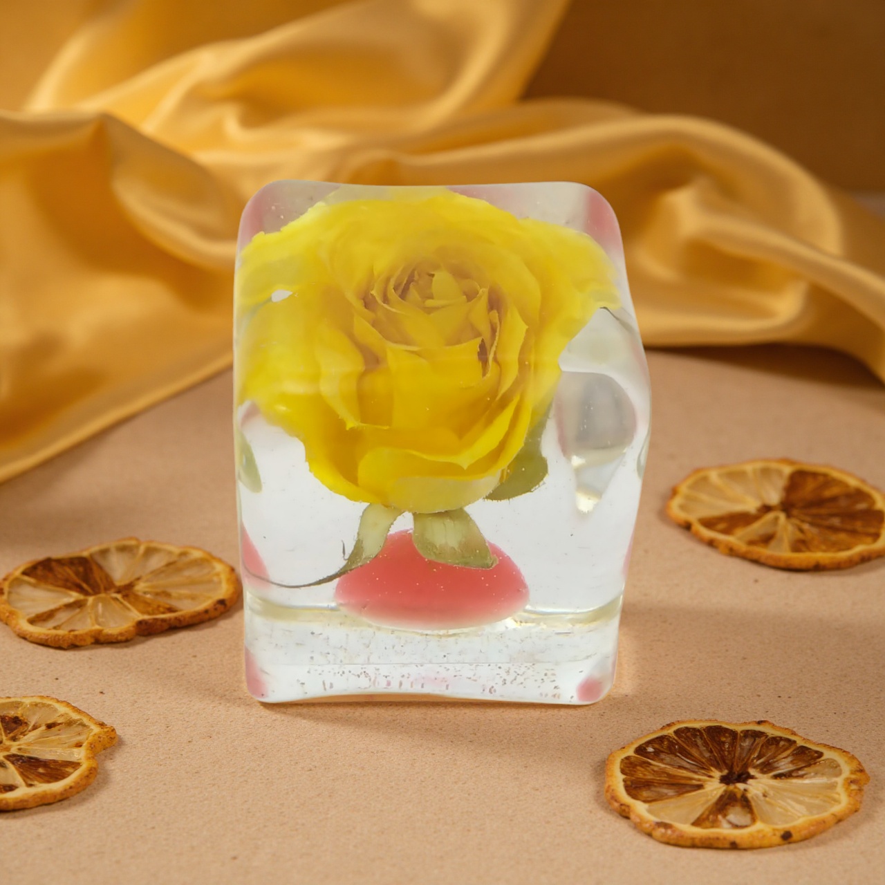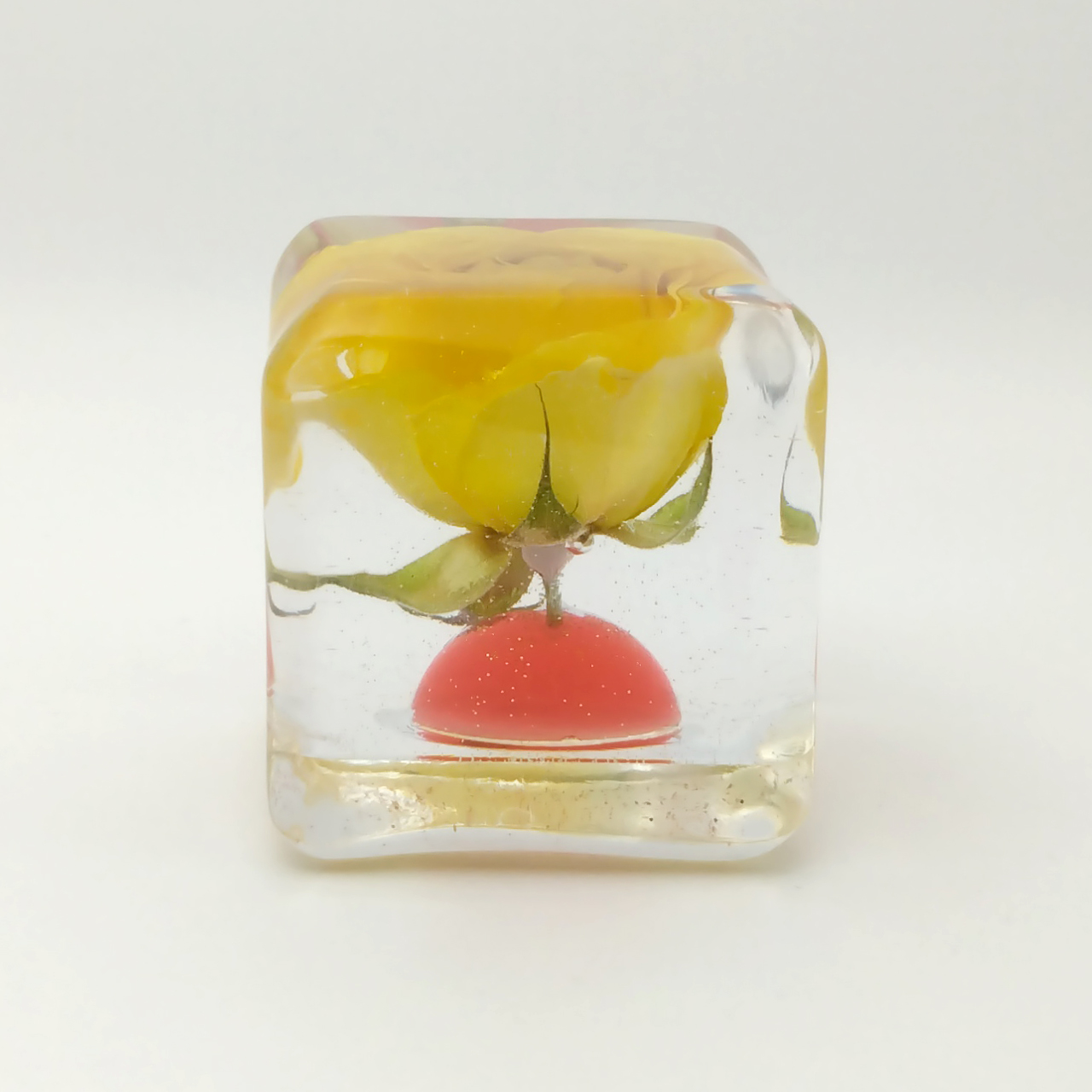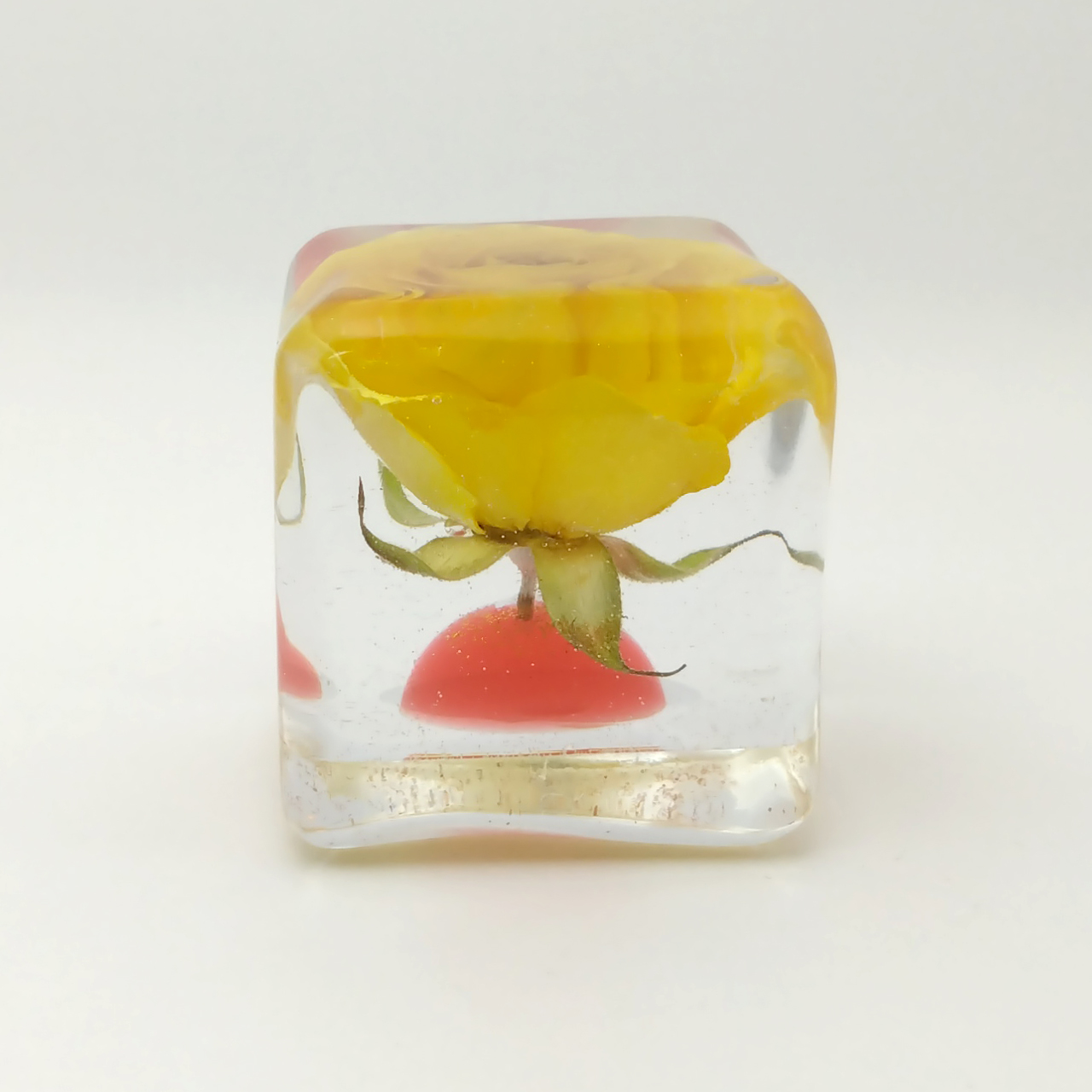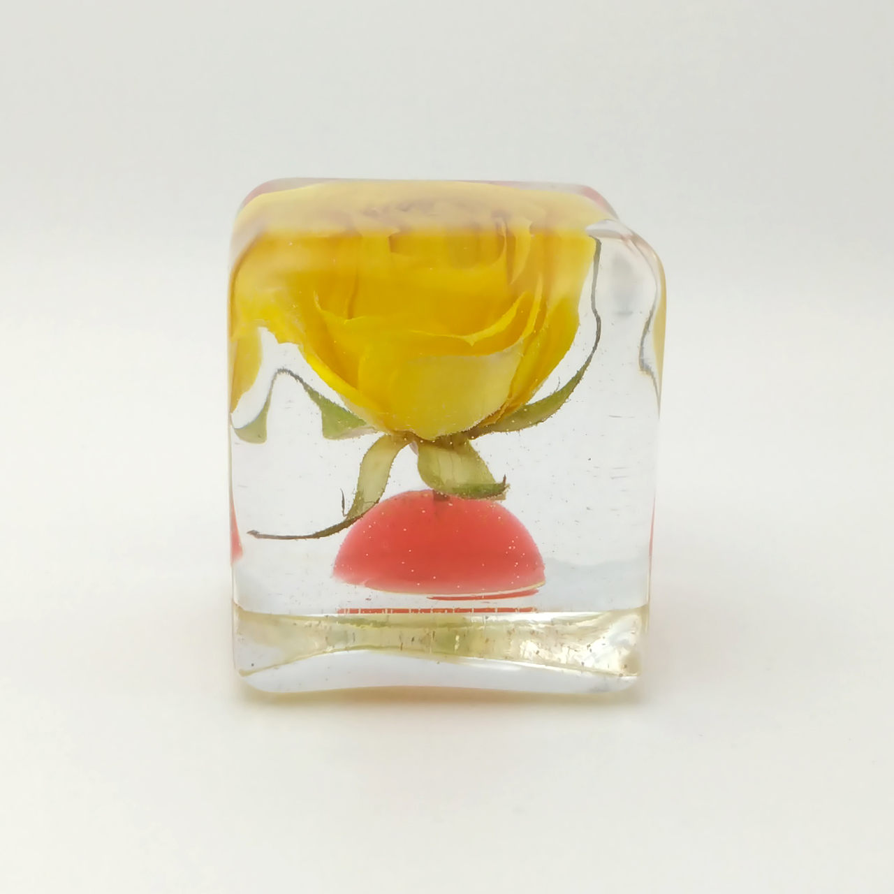 ドライフラワーバラをエポキシレジンに封入したキューブです。