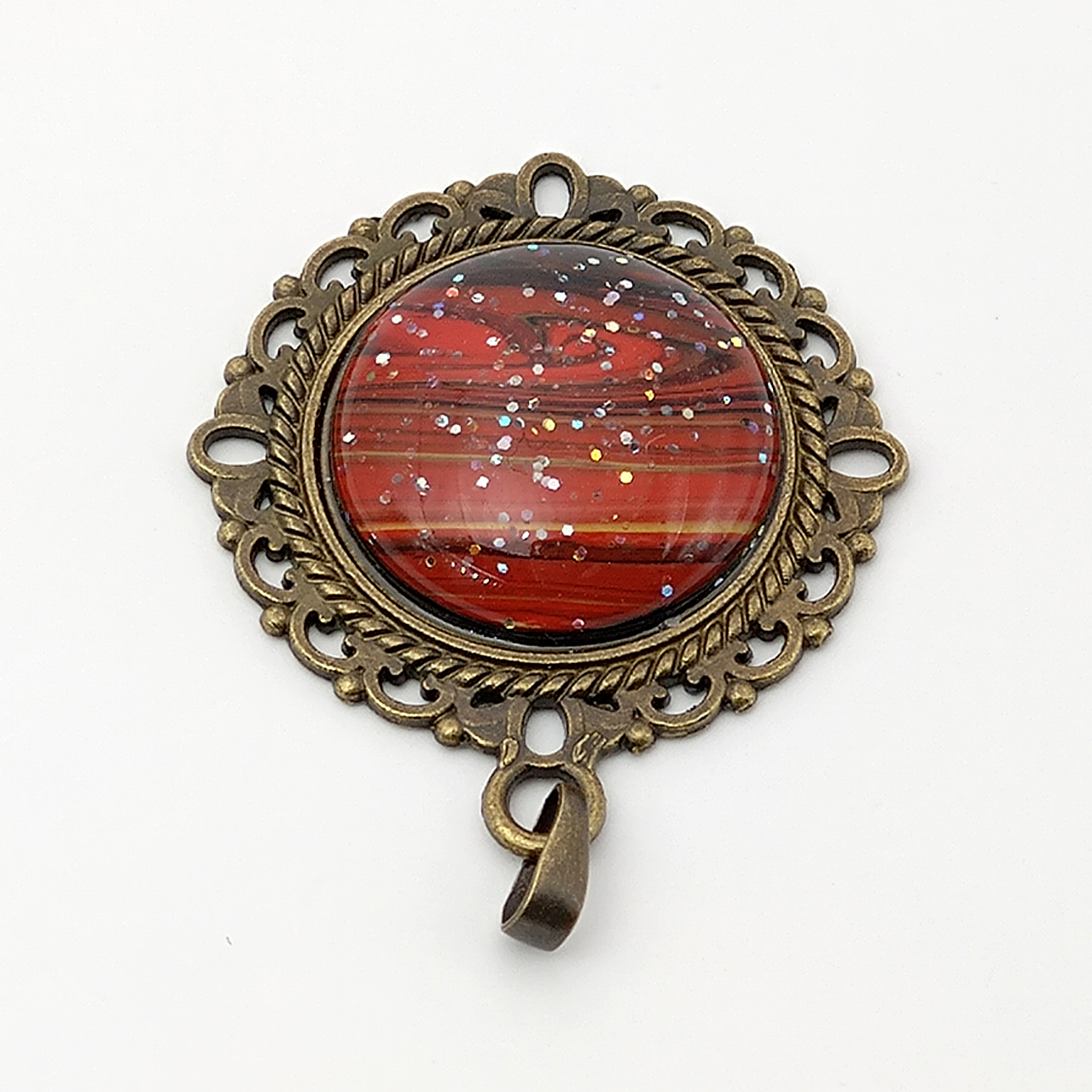 この製品はアンティークゴールド色(金古美)の枠にエポキシレジンでセッティングしております。