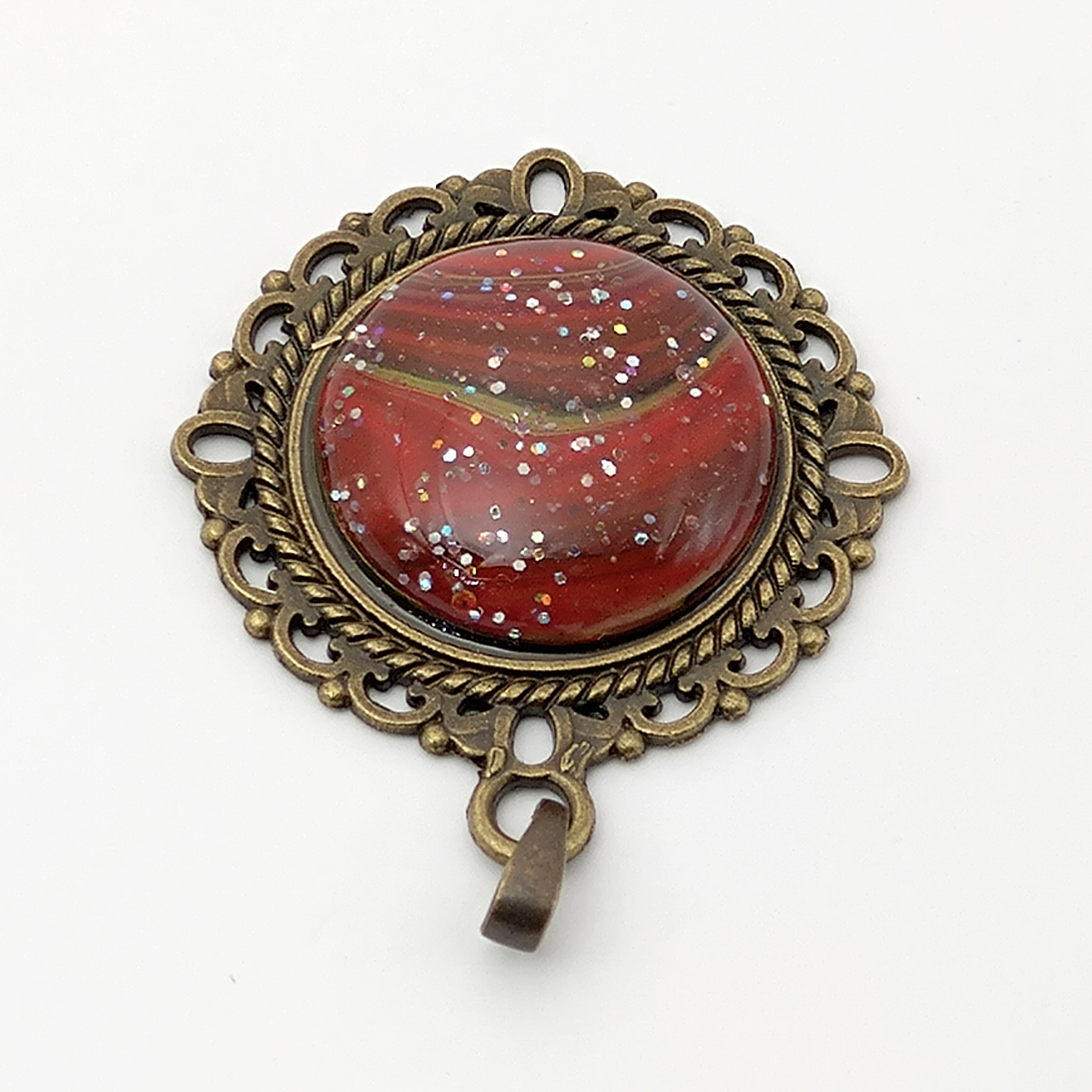 この製品はアンティークゴールド色(金古美)の枠にエポキシレジンでセッティングしております。