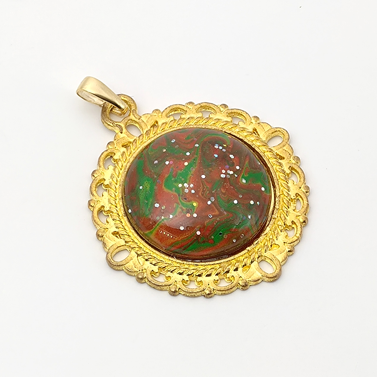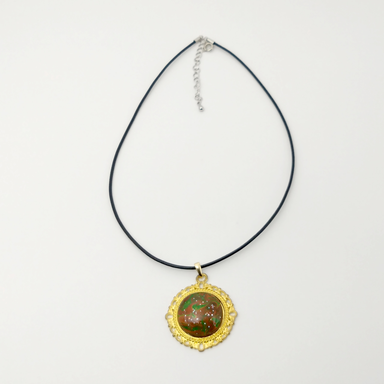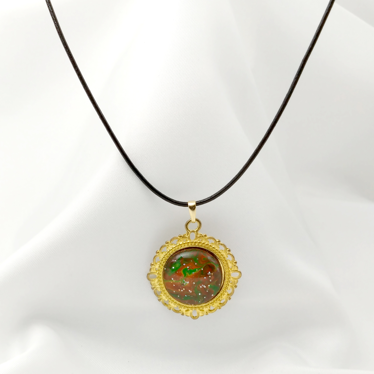 アートを身に纏う!ポーリングアートをレジンに封入した丸形ペンダントアクセサリーです。