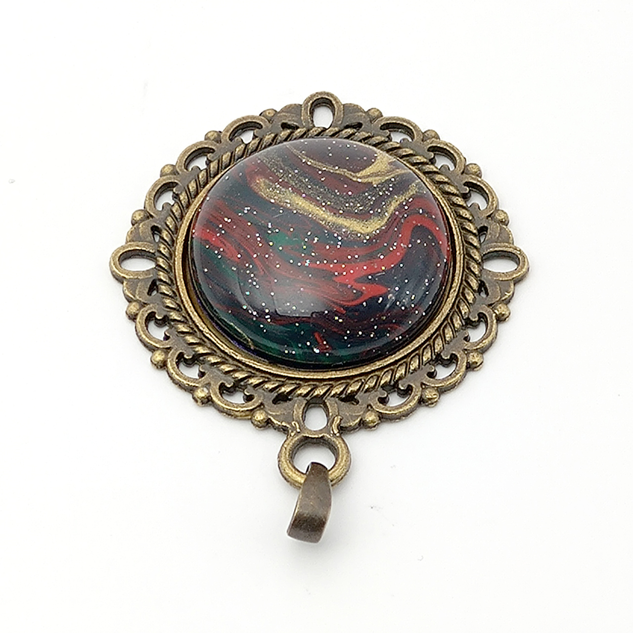 この製品はアンティークゴールド色(金古美)の枠にエポキシレジンでセッティングしております。