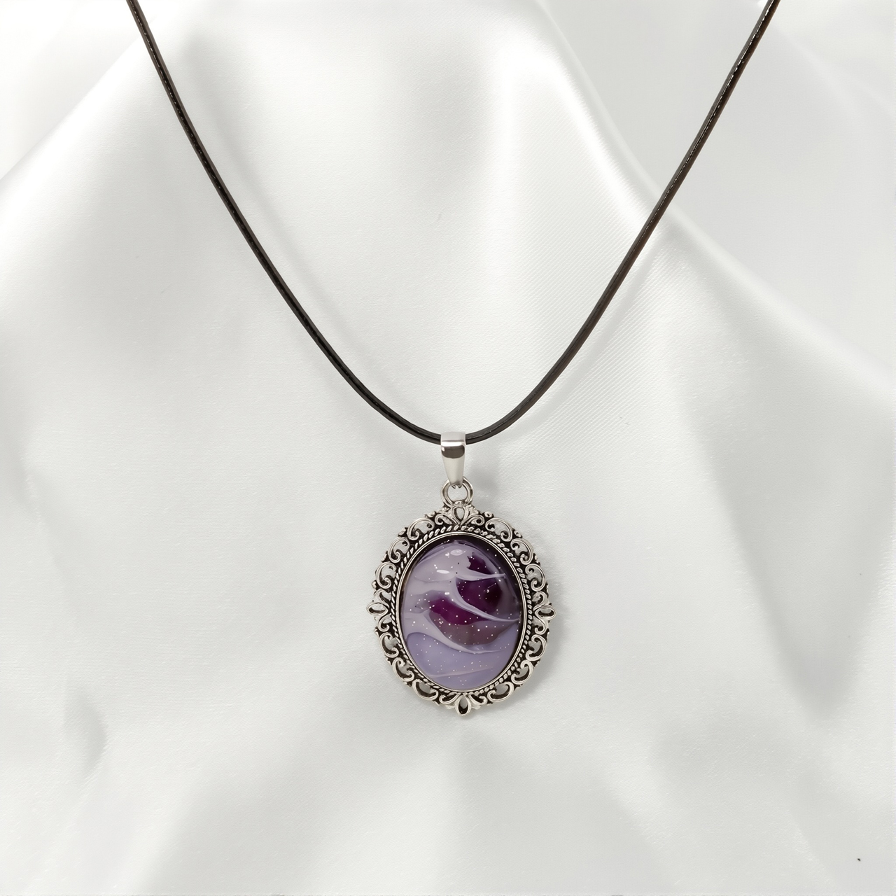 アートを身に纏う!ポーリングアートをレジンに封入した楕円形ペンダントアクセサリーです。