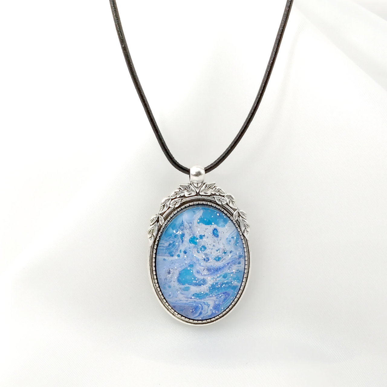 アートを身に纏う!ポーリングアートをレジンに封入した大型楕円形ペンダントアクセサリーです。